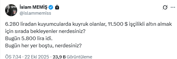 Altın ve para piyasası uzmanı İslam Memiş, sosyal medya hesabından altın almak için sıraya giren yatırımcılara düşüş sonrası 'nerdesiniz' diye çağrıda bulundu. Memiş, gram altının 6 bin 280 liradan satıldığı günlerde kuyruklar oluşturan yatırımcıların gram altının 5 bin 800 liraya düşüşü sonrasında nerede olduklarını sordu.