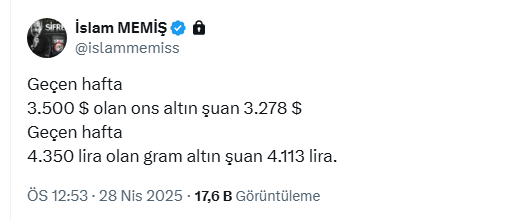 Altın fiyatlarındaki son dakika gelişmeleri değerlendiren Altın ve para piyaları uzmanı İslam Memiş, geçtiğimiz hafta ile bu haftaki altın fiyatlarını karşılatırdı. Memiş ''Geçen hafta 3.500 dolar olan ons altın şuan 3.278 dolar