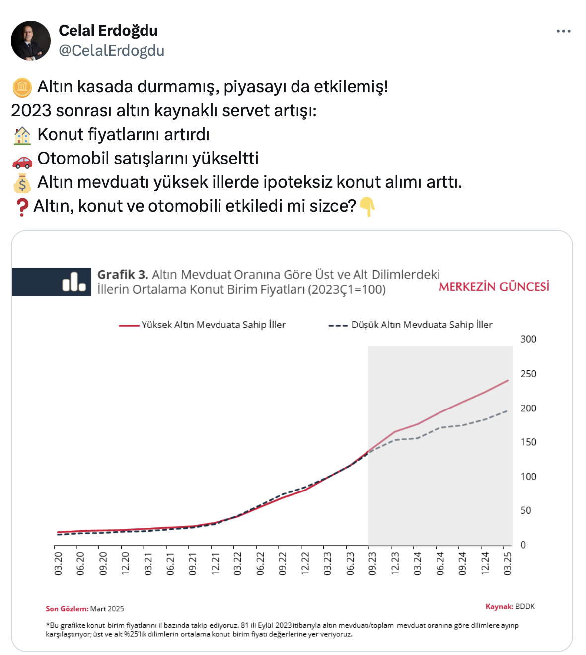 Şehir Plancısı ve Gayrimenkul Değerleme Uzmanı Celal Erdoğdu yaptığı paylaşımda altın mevduatı yüksek illerde ipoteksiz konut alımının arttığını belirtti.
