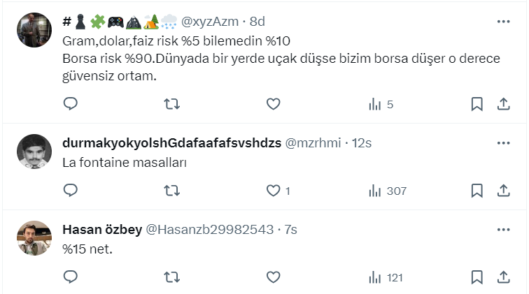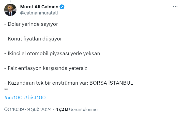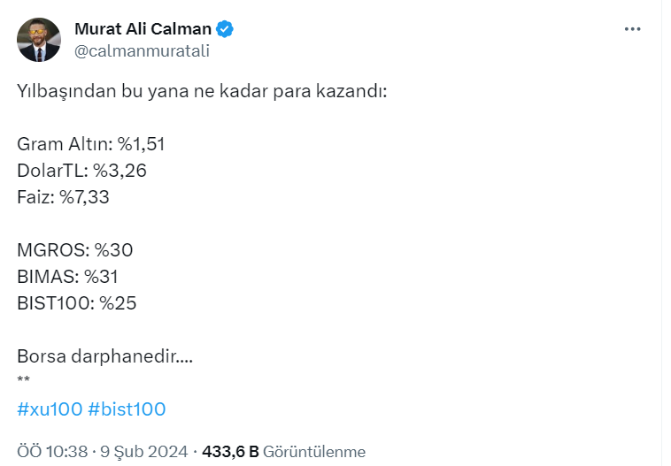 Murat Ali Calman söz konusu paylaşımda "Yılbaşından bu yana ne kadar para kazandı" ifadelerini kullanarak, altın, dolar faiz ve borsa verilerini paylaştı.