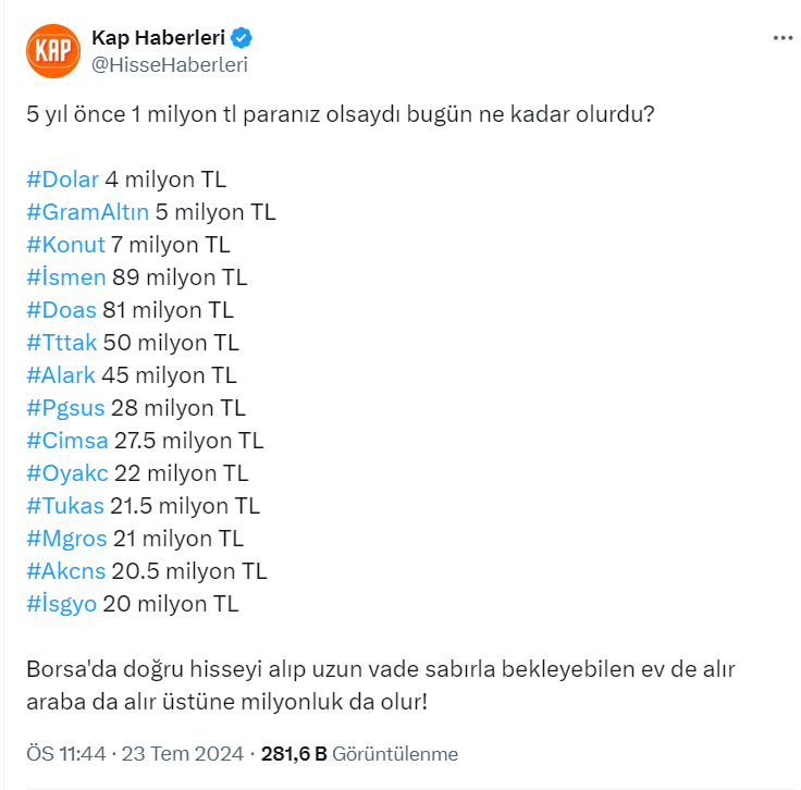 Pek çok kişi hangi yatırım aracına yatırım yapması gerektiğini araştırırken 238,3 bin takipçili KapHaberleri resmi sosyal medya hesabı https://x.com/HisseHaberleri üzerinden yaptığı paylaşımda dolar, altın, konut ve borsadan örnek vererek, 5 yılda hangisinin ne kadar kazandırdığını açıkladı.