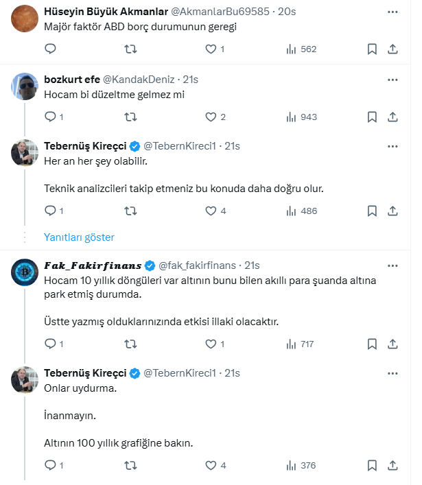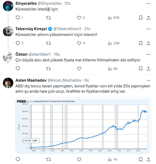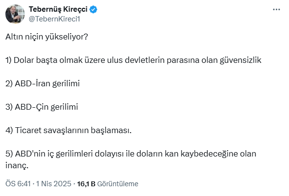 Yatırımcılar altın fiyatlarının yükselmeye devam edip etmeyeceğini merak ederken Türkiye'nin 1 numaralı emlak ve konut editörü Tebernüş Kireçci'den altın değerlendirmesi geldi. Kireçci, sosyal medya hesabından altın fiyatlarının neden yükseldiğini beş maddede açıkladı. İşte o paylaşım ve gelen yorumlar...
