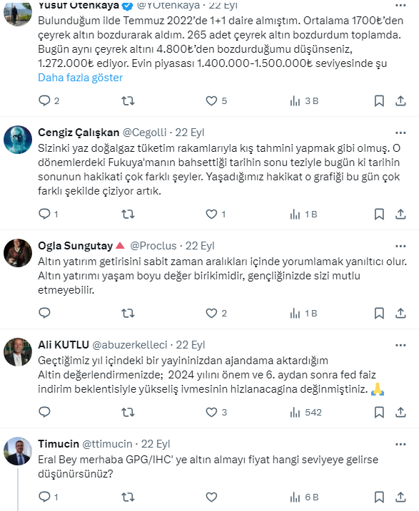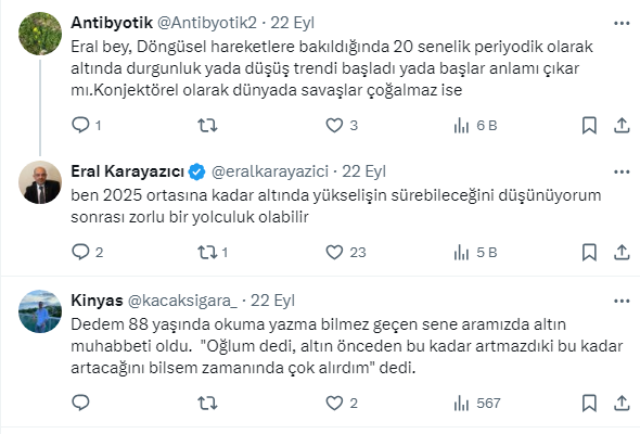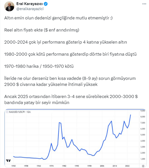 'Altın emin olun dedenizi gençliğinde mutlu etmemiştir' diyen Karayazıcı, 1980-2000 yılları arasında çok kötü performans gösterdip dörtte biri fiyatına düştüğünü, 2000'den 2024'e 4 katına çıktığına dikkat çekti.