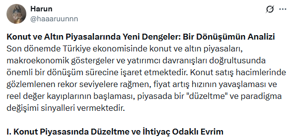 Sosyal medya hesabı X'ten paylaşımları ile dikkatleri çeken Harun isimli analist, altından konuta kayışın nedenlerini tüm ayıntılarıyla paylaştı.