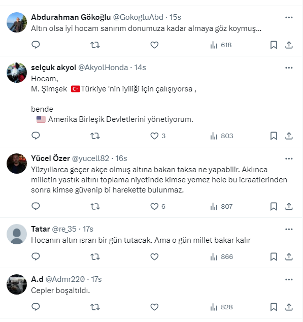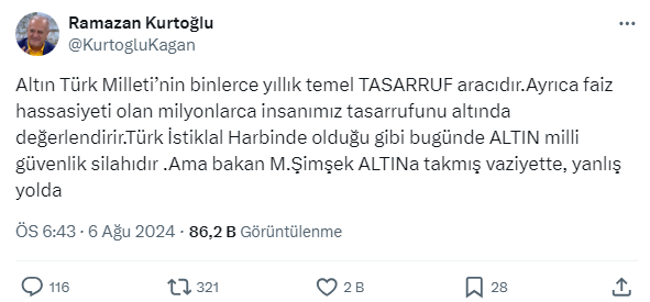 Altın Türk Milleti’nin binlerce yıllık temel TASARRUF aracıdır.Ayrıca faiz hassasiyeti olan milyonlarca insanımız tasarrufunu altında değerlendirir.Türk İstiklal Harbinde olduğu gibi bugünde ALTIN milli güvenlik silahıdır .Ama bakan M.Şimşek ALTINa takmış vaziyette, yanlış yolda.