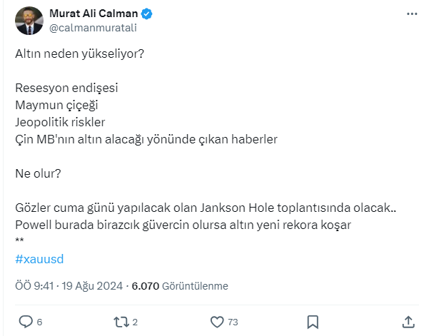 Bu haftanın çok kritik olduğunu belirten Calman, cuma günü yapılacak olan Jankson Hole toplantısında, Powell'ın güvercin tonda açıklamalar yapmasıyla altının asıl rekorunu kıracağını açıkladı.