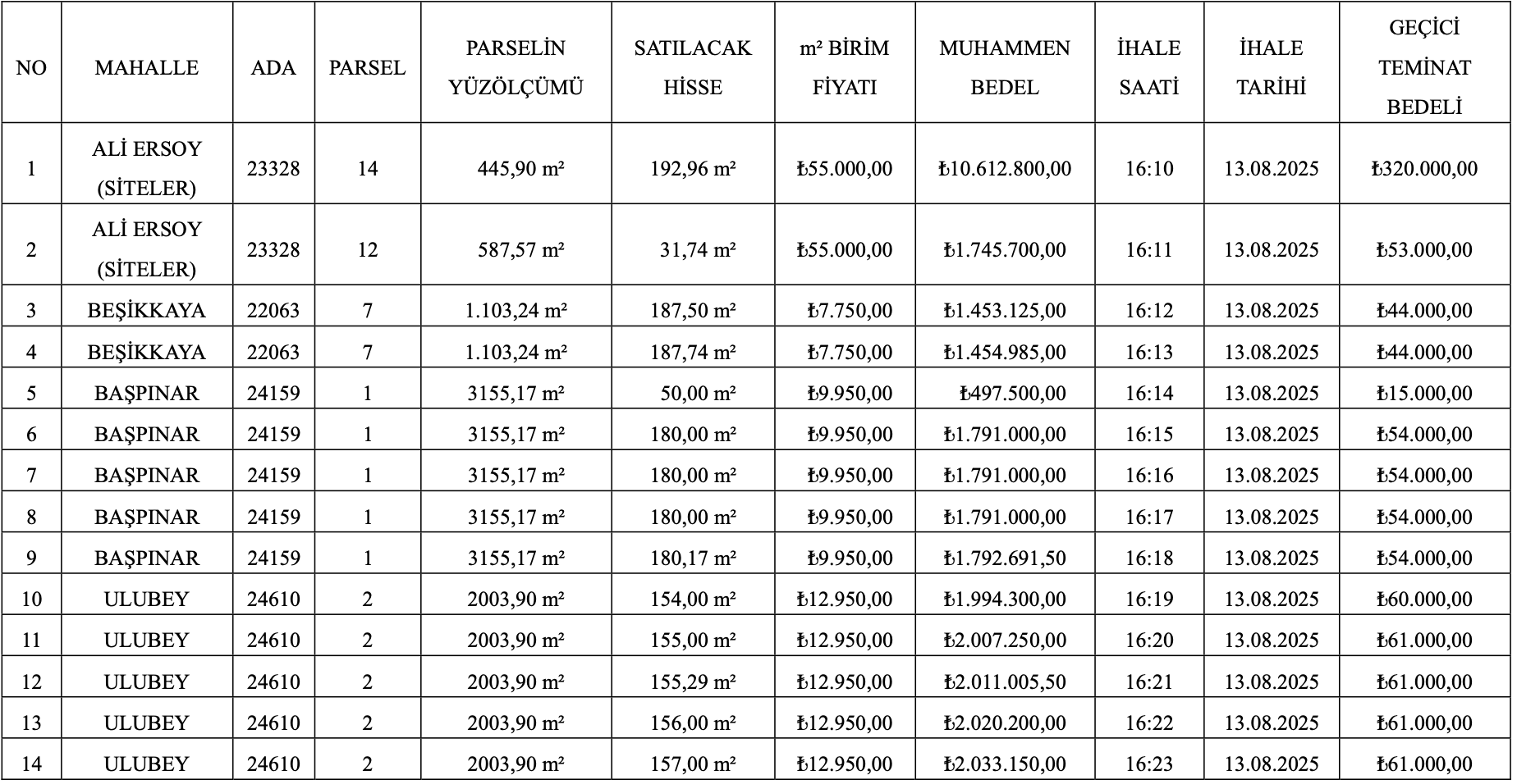 İlçemiz sınırları içerisinde; mülkiyeti Belediye Başkanlığımıza ait Ali Ersoy (Siteler), Beşikkaya, Başpınar ve Ulubey Mahallelerinde bulunan ve aşağıda, bilgileri yer alan taşınmazların; 2886 sayılı Kanunun 45. maddesine göre 03.01.2023 tarih ve 6 sayılı Meclis Kararına ve 16.07.2025 tarih 2760 sayılı Encümen Kararına istinaden “Açık Teklif Usulü (artırmalı)” yöntemi geçerli olacak şekilde taşınmaz satış ihalesi gerçekleştirilecek olup; satış bedeli, hesaplanan diğer vergi ve harçlar ile tüm giderler peşin olarak müşteri tarafından ödenmek kaydı ile taşınmaza ait tapu devir işlemi İdaremizce sağlanacaktır. İhalede 2886 sayılı Kanunun 45. maddesi kapsamında “Açık Teklif Usulü (artırmalı)” yöntemi kuralları geçerlidir.