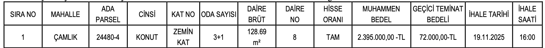İlçemiz sınırları içerisinde Belediye Başkanlığımız mülkiyetinde bulunan Çamlık Mahallesi 24480 ada 4 nolu parseldeki Zemin kat 8 numaralı bağımsız bölüm, mülkiyeti Belediyemize ait taşınmazın; 03.01.2023 tarih ve 6 sayılı Meclis Kararına istinaden 5393 sayılı Yasanın 69. maddesine göre ve 22.10.2025 tarih ve 5111 sayılı Encümen Kararı ile açık arttırma suretiyle İhale satışı yapılacak olup; hesaplanan diğer vergi ve harçlar ile tüm giderler peşin olarak tahsil edilecektir.