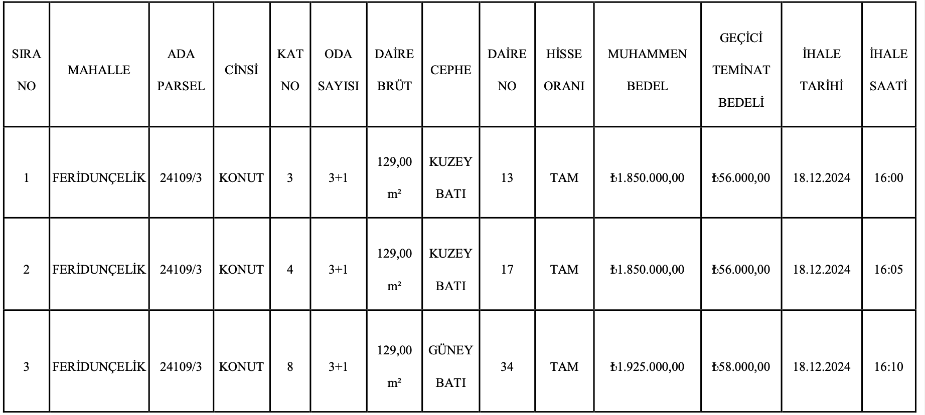 İlçemiz sınırları içerisinde Belediye Başkanlığımız mülkiyetinde bulunan Feridunçelik Mahallesi 24109 ada 3 nolu parseldeki 3.Kat 13, 4.Kat 17 ve 8.Kat 34 numaralı bağımsız bölümlerin, mülkiyeti Belediye Başkanlığımıza ait taşınmazların; 03.01.2023 tarih ve 6 sayılı Meclis Kararına istinaden 5393 sayılı yasanın 69. maddesine göre ve 13.11.2024 tarih ve 511 sayılı Encümen Kararı ile açık arttırma suretiyle İhale satışı yapılacak olup; hesaplanan diğer vergi ve harçlar ile tüm giderler peşin olarak tahsil edilecektir.