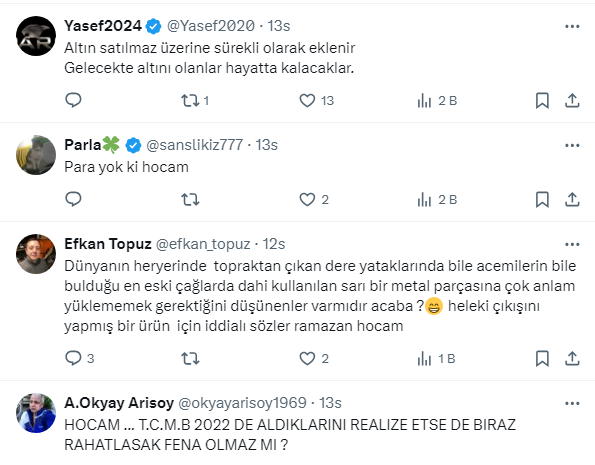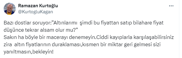 İstanbul Aydın Üniversitesi Öğretim Üyesi olan Ekonomist Ramazan Kurtoğlu, kendisine yöneltilen “Altınlarımı şimdi bu fiyattan satıp bilahare fiyat düşünce tekrar alsam olur mu?” sorusuna https://twitter.com/KurtogluKagan X sosyal medya hesabından cevap verdi. Kurtoğlu, “Sakın ha böyle bir macerayı denemeyin.Ciddi kayıplarla karşılaşabilirsiniz zira altın fiyatlarının duraklaması, kısmen bir miktar geri gelmesi sizi yanıltmasın, bekleyin” tavsiyesinde bulundu.
