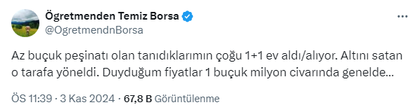 Öğretmenden temiz borsa isimli twitter kullanıcısı, peşinatı olanlar ile altın yatırımcılarının konuta yöneldiğini örnek vererek açıkladı. Özellikle çevresindekilerin altınlarını bozdurarak 1+1 konuta aldığını söyleyen Öğretmenden temiz borsa isimli twitter kullanıcısı fiyatların genellikle 1 milyon lira civarında olduğunu açıkladı. İşte sosyal medya hesabı X'ten yaptığı o paylaşım ve gelen yorumlar...