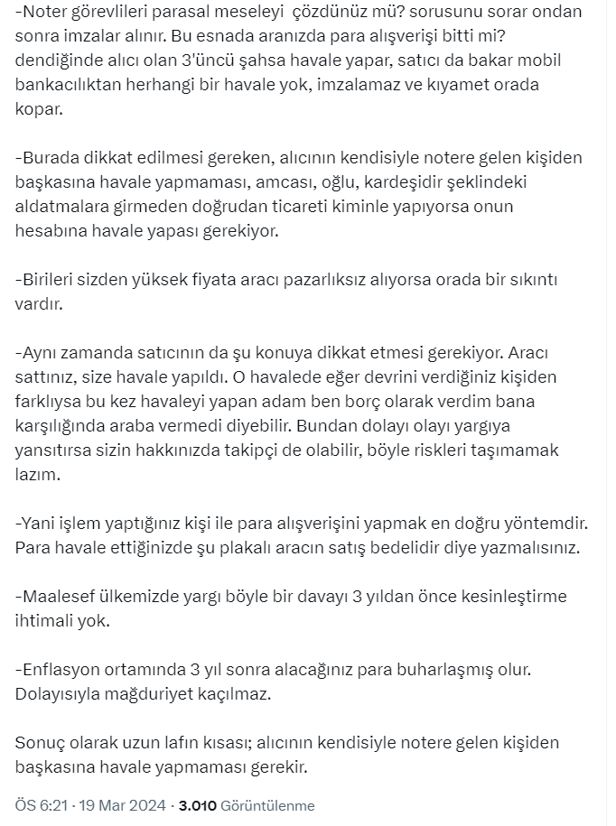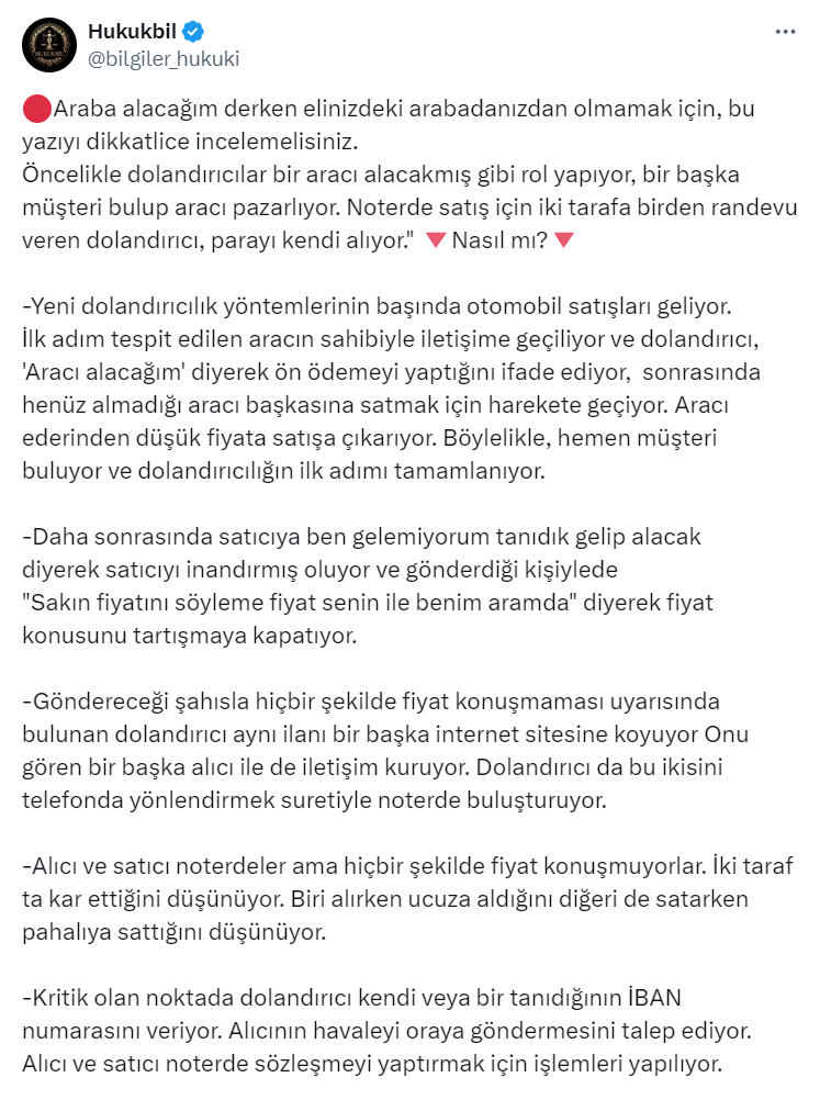 Her gün yeni bir yöntem bulan dolandıcılar şimdi de gözlerine otomobil almak isteyenleri kestirdi. Yeni bir otomobil sahibi olmak isteyenler araba alırken nelere dikkat etmesi gerektiği ile ilgili araştırmalar yaparken sosyal medya üzerinden yaptığı paylaşımlarla dikkat çeken 8 bin 183 takipçili Hukukbil isimli kullanıcı, https://twitter.com/bilgiler_hukuki X sosyal medya hesabından araba almak isteyenler için çok önemli bir paylaşım yaptı.