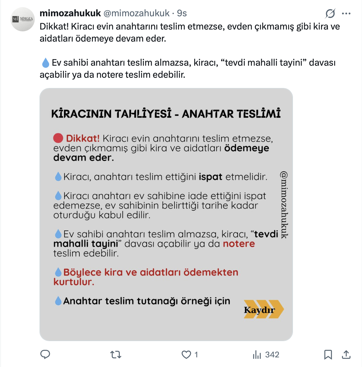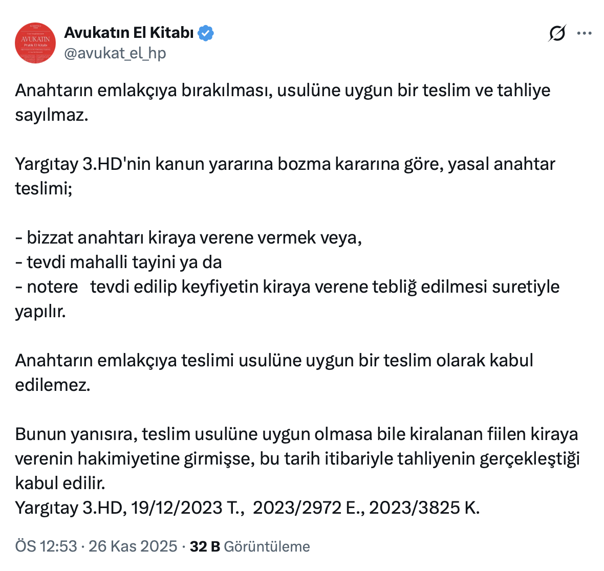 Avukatın El Kitabı isimli kullanıcı resmi X hesabı https://x.com/avukat_el_hp üzerinden söz konusu konu ile ilgili olarak bir paylaşım yaparak, anahtarın emlakçıya bırakılmasının usulüne uygun bir teslim ve tahliye sayılmayacağını belirtti.