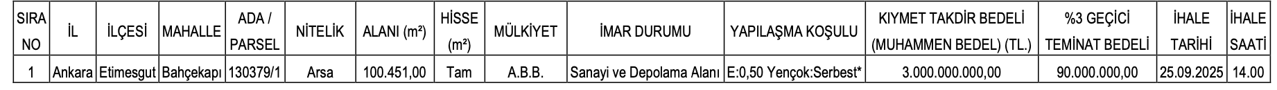 Sanayi ve depolama alanı imarlı arsanın muhammen bedeli 3 milyar TL olarak açıklanırken, teminat bedeli ise 90 milyon TL olarak açıklandı.