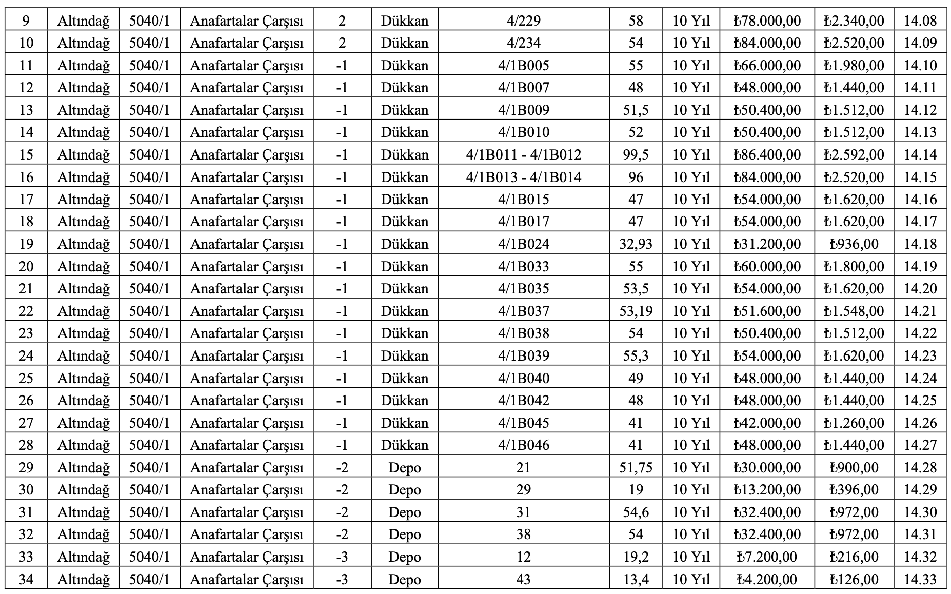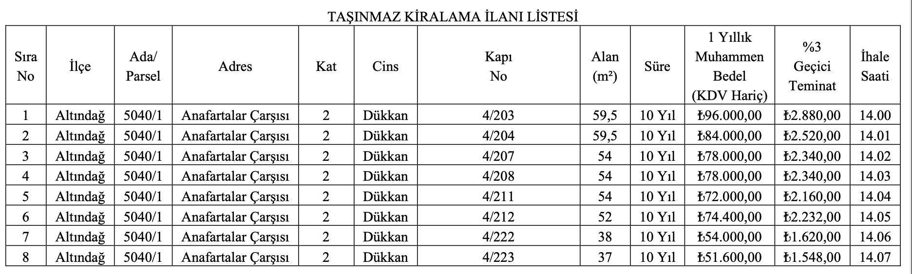 Dükkanlar için en yüksek 1 yıllık kira bedeli 156 bin TL, en düşük 1 yıllık kira bedeli 4 bin 200 TL olarak açıklanırken, en yüksek geçici teminat bedeli 4 bin 680 TL, en düşük geçici teminat bedeli ise 126 TL olarak açıklandı.