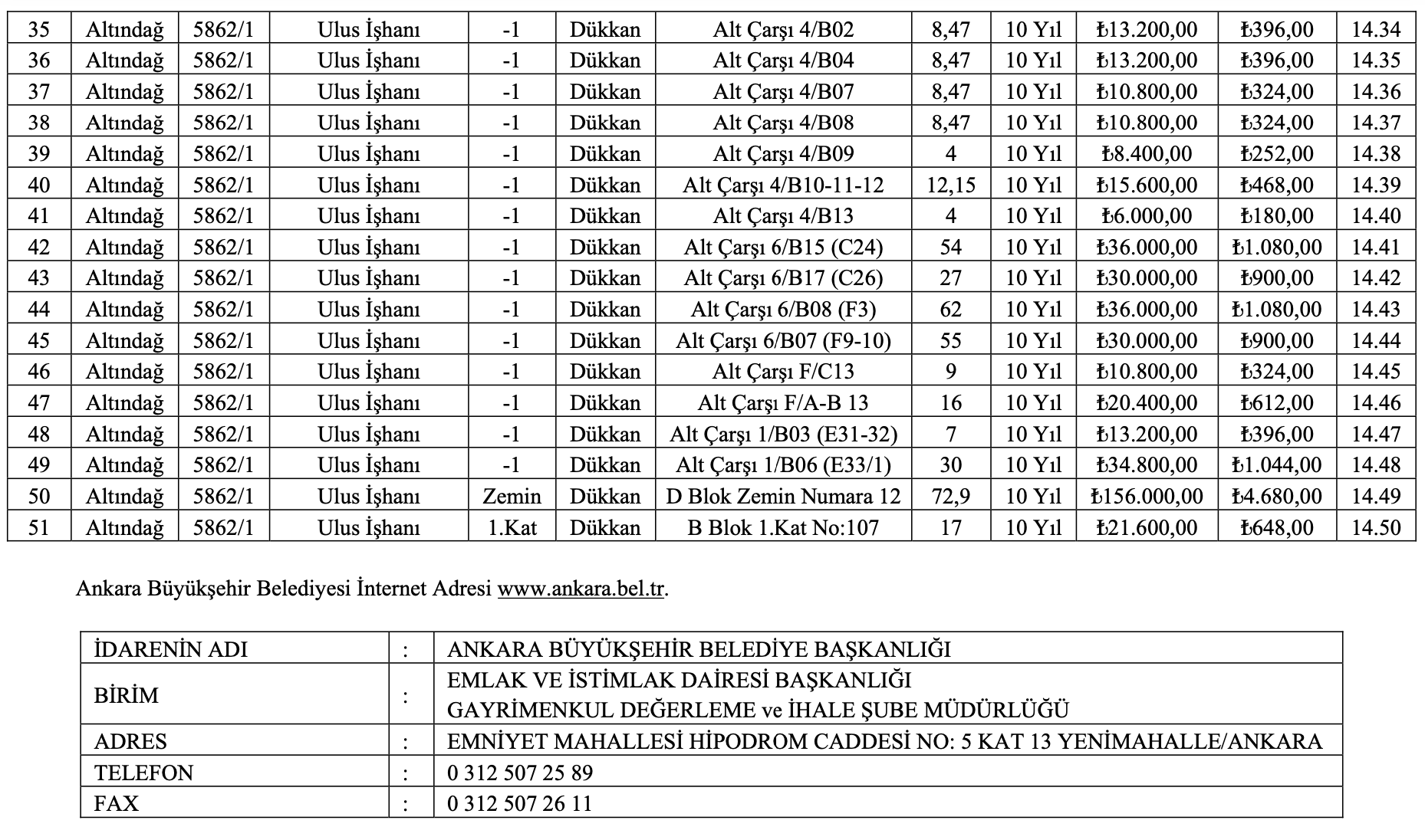 Ankara Büyükşehir Belediye Başkanlığı, Ankara Altındağ’da yer alan 51 adet dükkanı 10 yıllığına kiraya verecek. Dükkanların kiralama ihalesi 26 Aralık 2024 tarihinde gerçekleştirilecek.