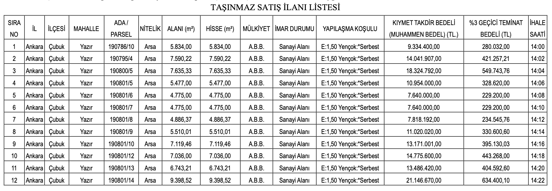 Sanayi alanı imarlı arsaların muhammen bedelleri 7 milyon 467 bin 120 TL ile 21 milyon 146 bin 670 TL arasında, konutların muhammen bedelleri 9 milyon TL ile 17 milyon 750 bin TL arasında değişirken, mağazaların muhammen bedelleri 1 milyon 100 bin TL ve 1 milyon 250 bin TL olarak açıklandı.