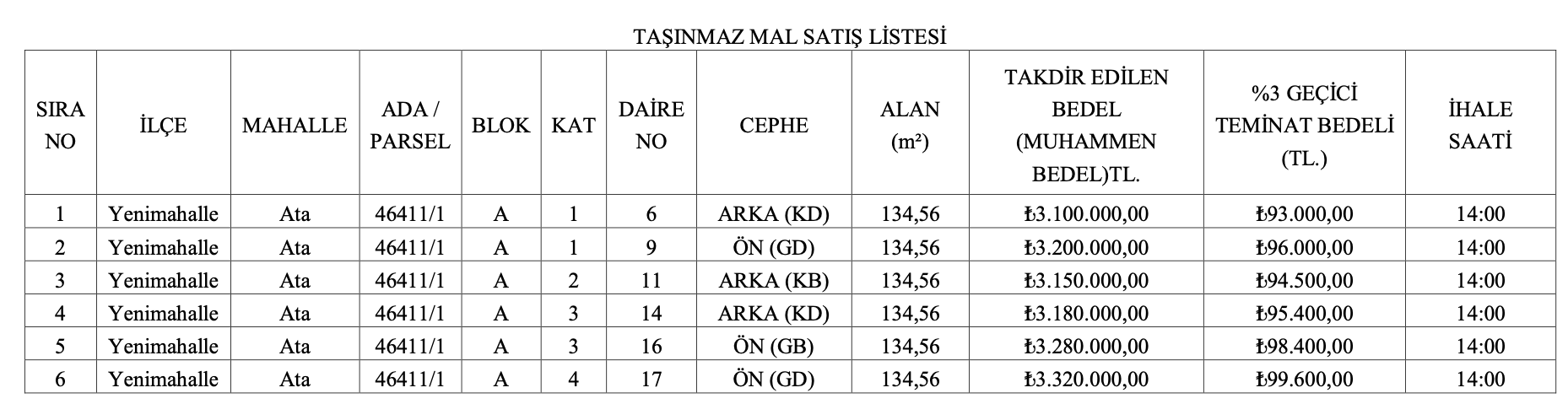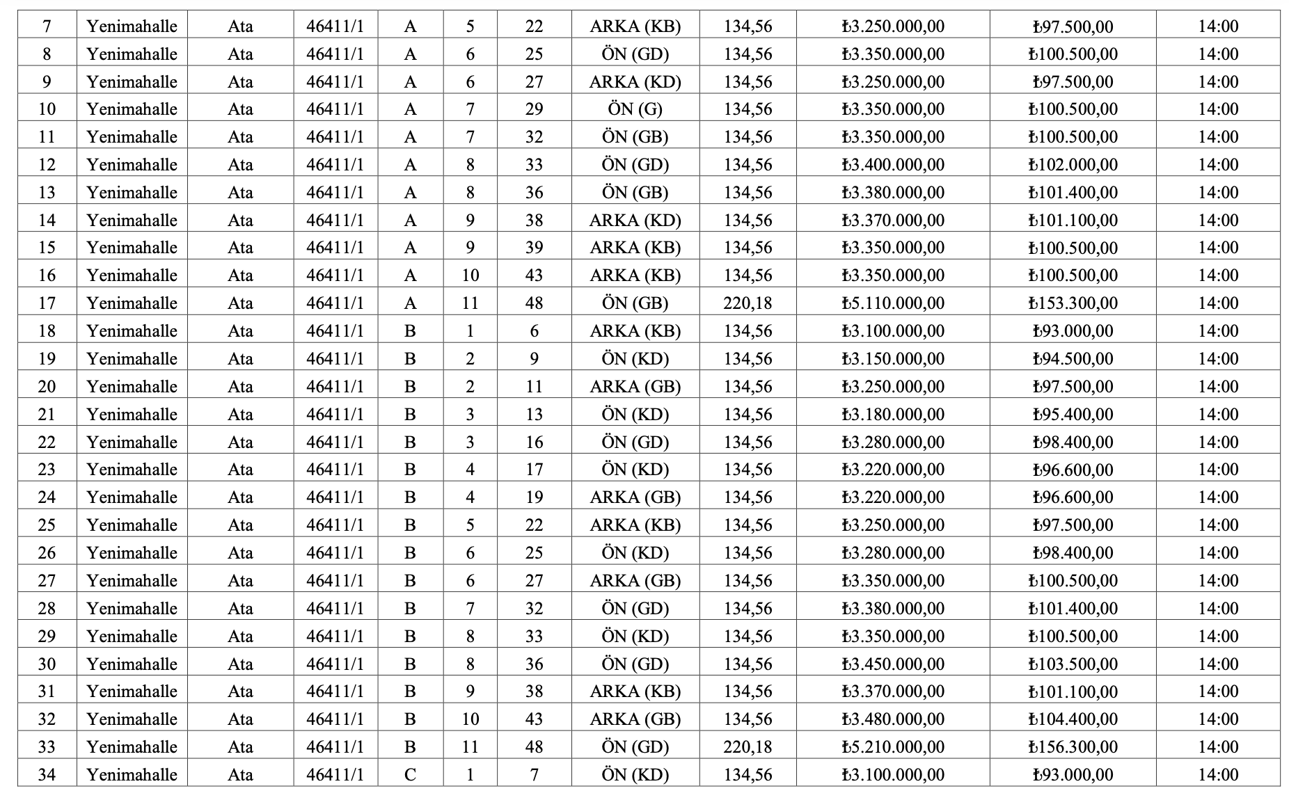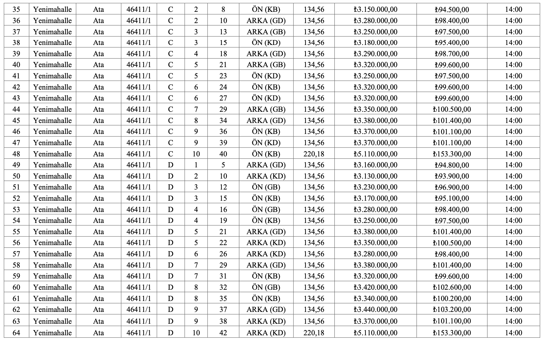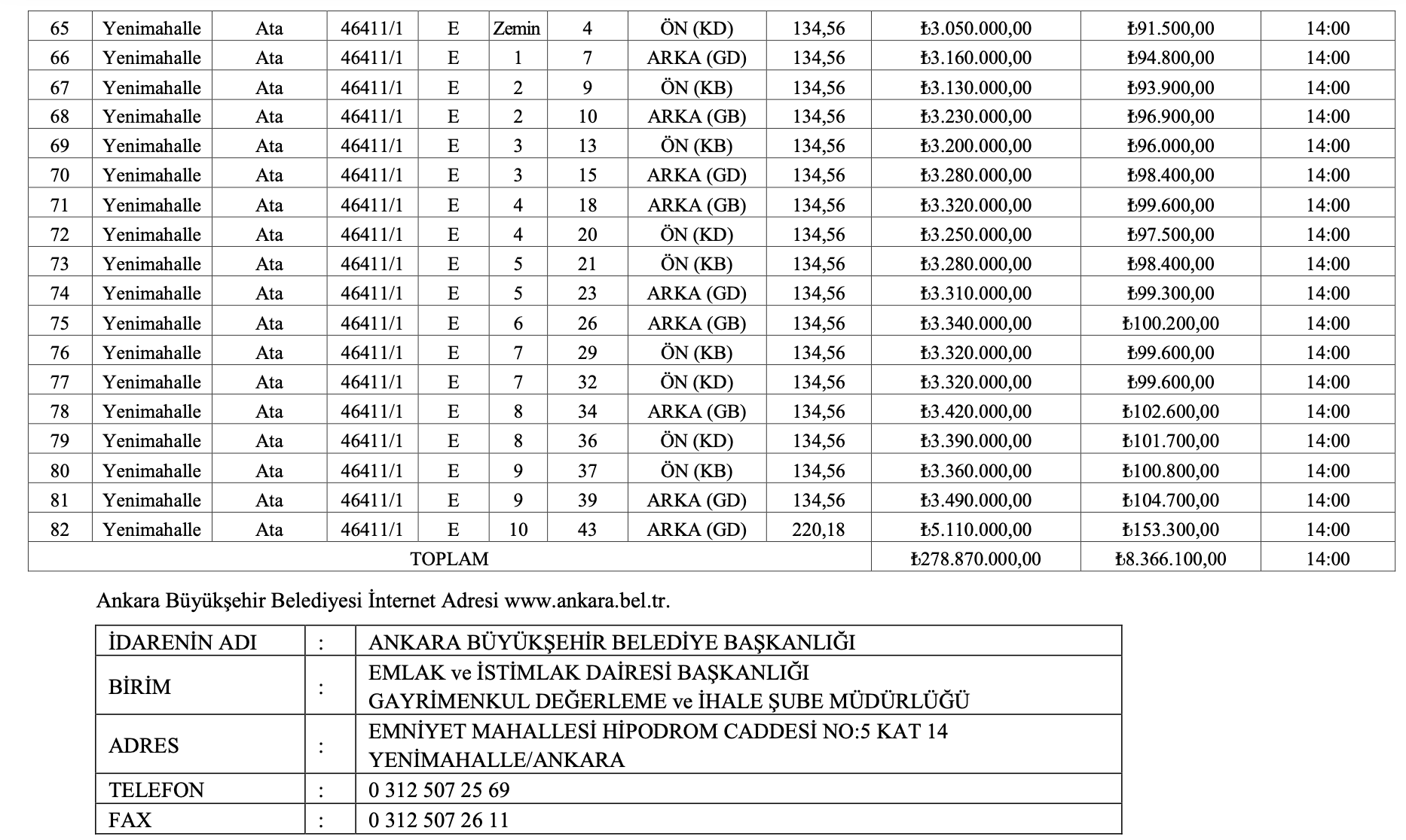 Mülkiyeti Belediyemize ait Yenimahalle İlçesi Ata Mahallesi 46411 ada 1 parsel üzerinde bulunan aşağıdaki listede bağımsız bölüm numarası, kıymet takdir bedeli (muhammen bedeli), geçici teminatı ve diğer özellikleri yazılı 82 adet (Mesken) taşınmazlar, 2886 sayılı Devlet İhale Kanunu’nun 36. maddesi gereğince kapalı teklif usulü ile satış bedeli, ihale karar pulu, sözleşme karar pulu, ilan giderleri ve diğer giderleri peşin ödenmesi şartıyla toptan olarak mülkiyet satışı yapılacaktır.