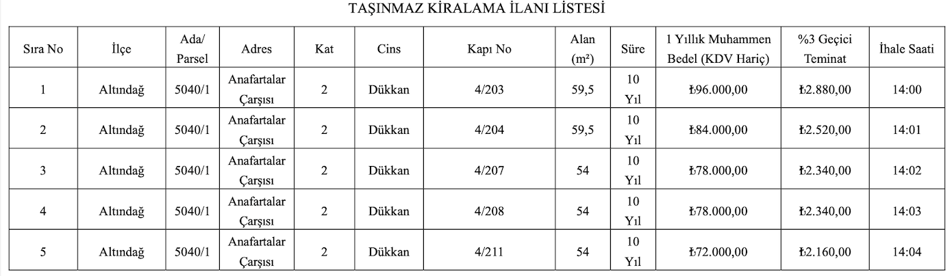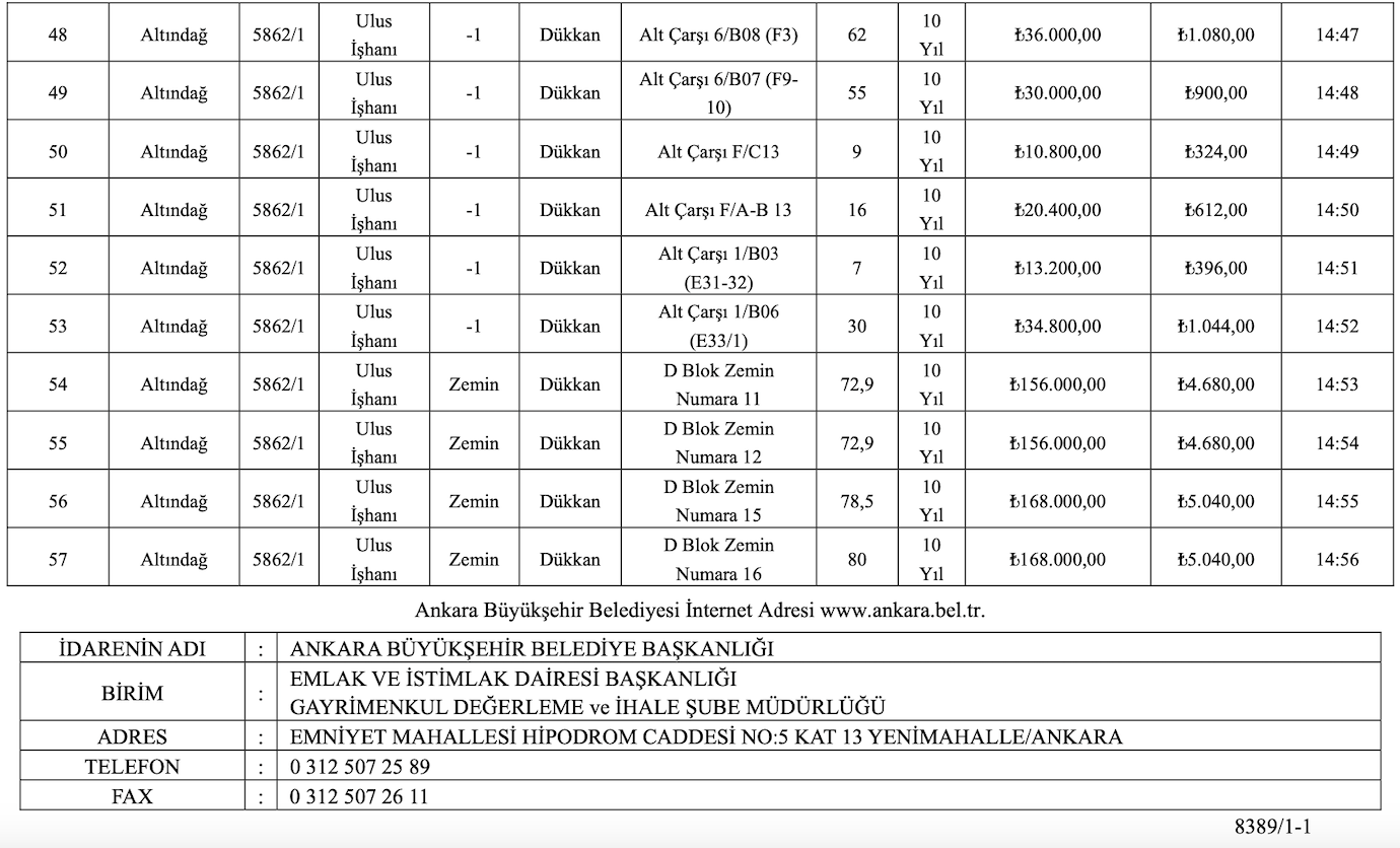 Ankara Büyükşehir Belediye Başkanlığı, Altındağ Ulus İşhanı’ndan yer alan 57 adet dükkan ve depo için kiralama ihalesi düzenliyor.