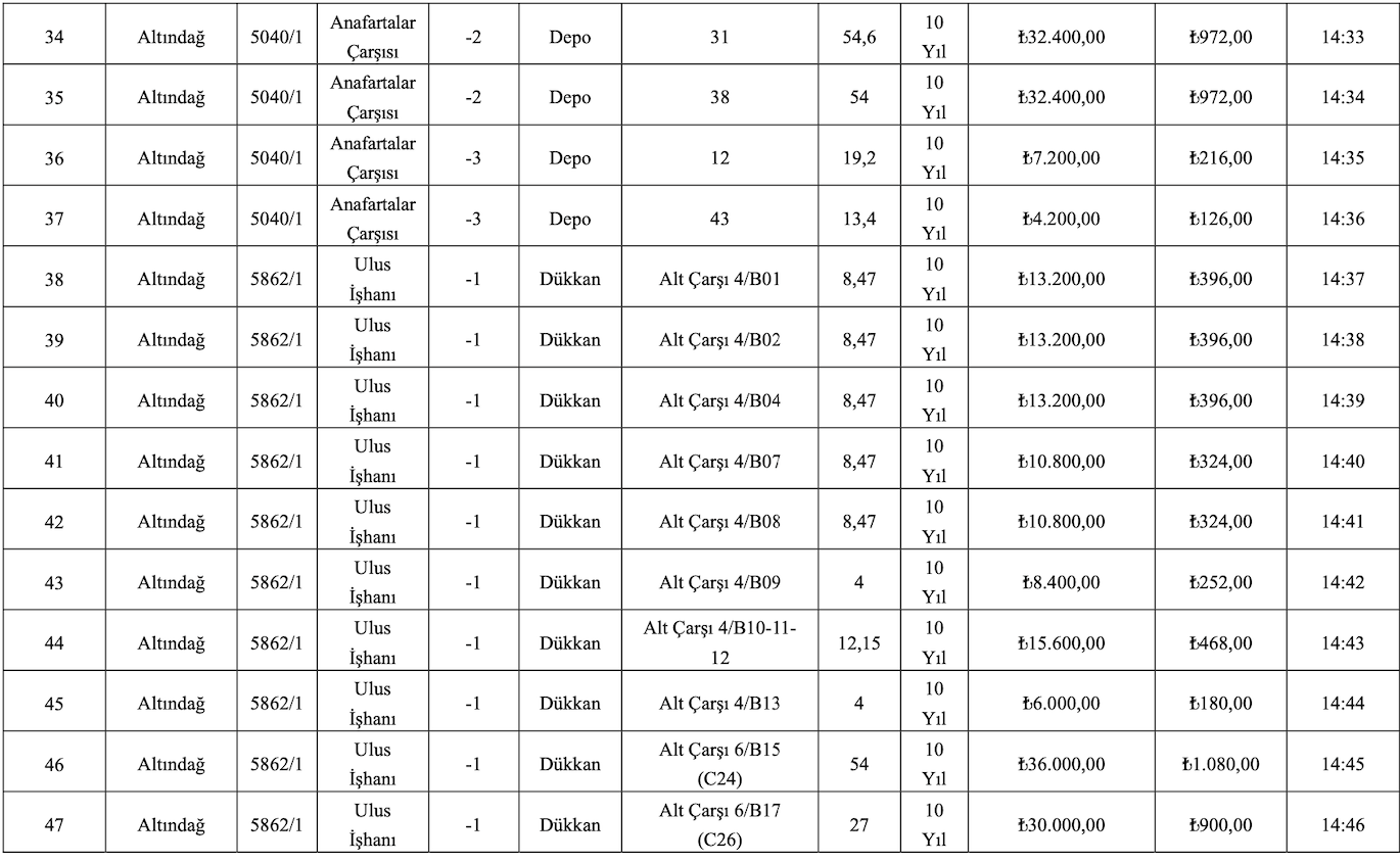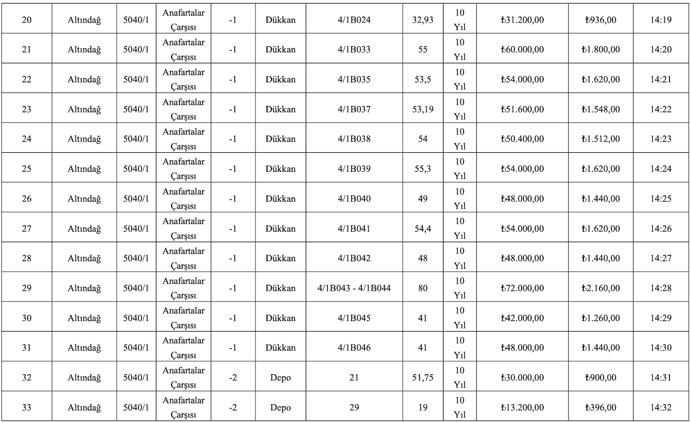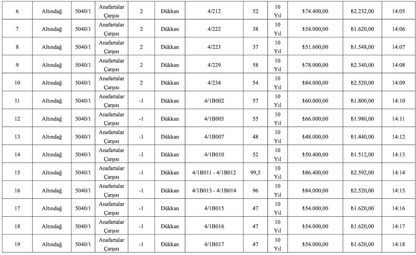 10 yıllığına kiraya verilecek olan dükkanları 1 yıllık kira bedelleri 6 bin TL ile 168 bin TL arasında farklılık gösterirken, geçici teminat bedelleri ise 180 TL ile 5 bin 40 TL arasında farklılık gösteriyor. Depoların ise kira bedelleri 4 bin 200 TL ile 32 bin 400 TL arasında değişirken, geçici teminat bedelleri ise 126 TL ile 972 TL arasında değişiyor.