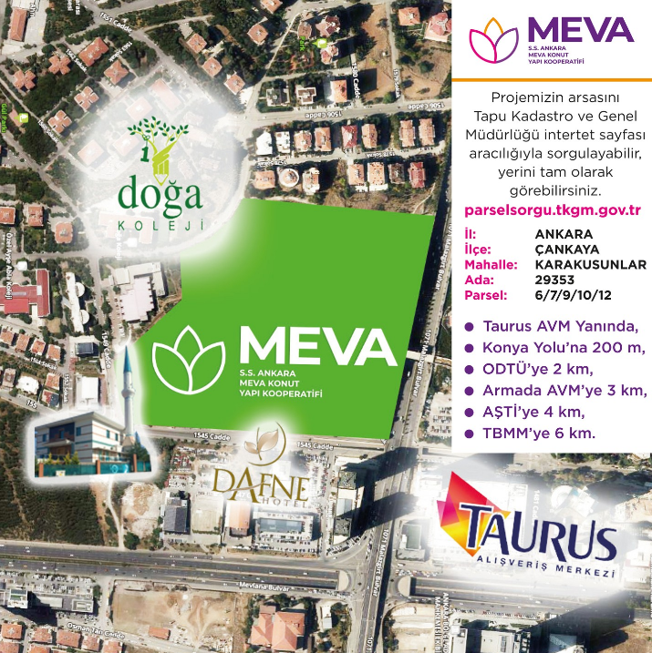 Ankara Meva Konut Yapı Kooperatifi, Ankara ili Çankaya ilçesi Karakusunlar (Çiğdem) mahallesinde bulunan çok değerli arsada prestijli bir konut projesini hayata geçiriyor.