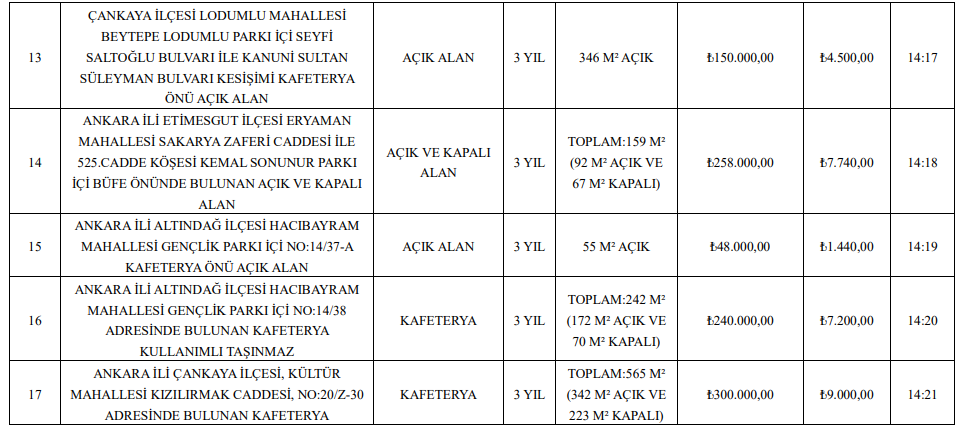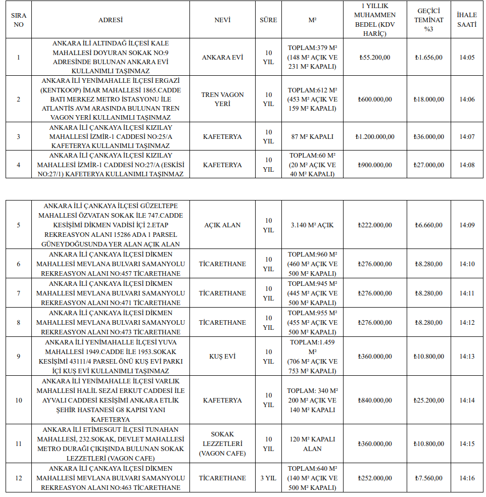 Ankara ve Gaziantep'te yer alan 18 gayrimenkul kiraya verilecek. Ankara Büyükşehir Belediyesi tarafından kiralanacak olan gayrimenkullerin 1 yıllık kira bedelleri 48 bin TL ve 1 milyon 200 bin TL arasında değişiyor.