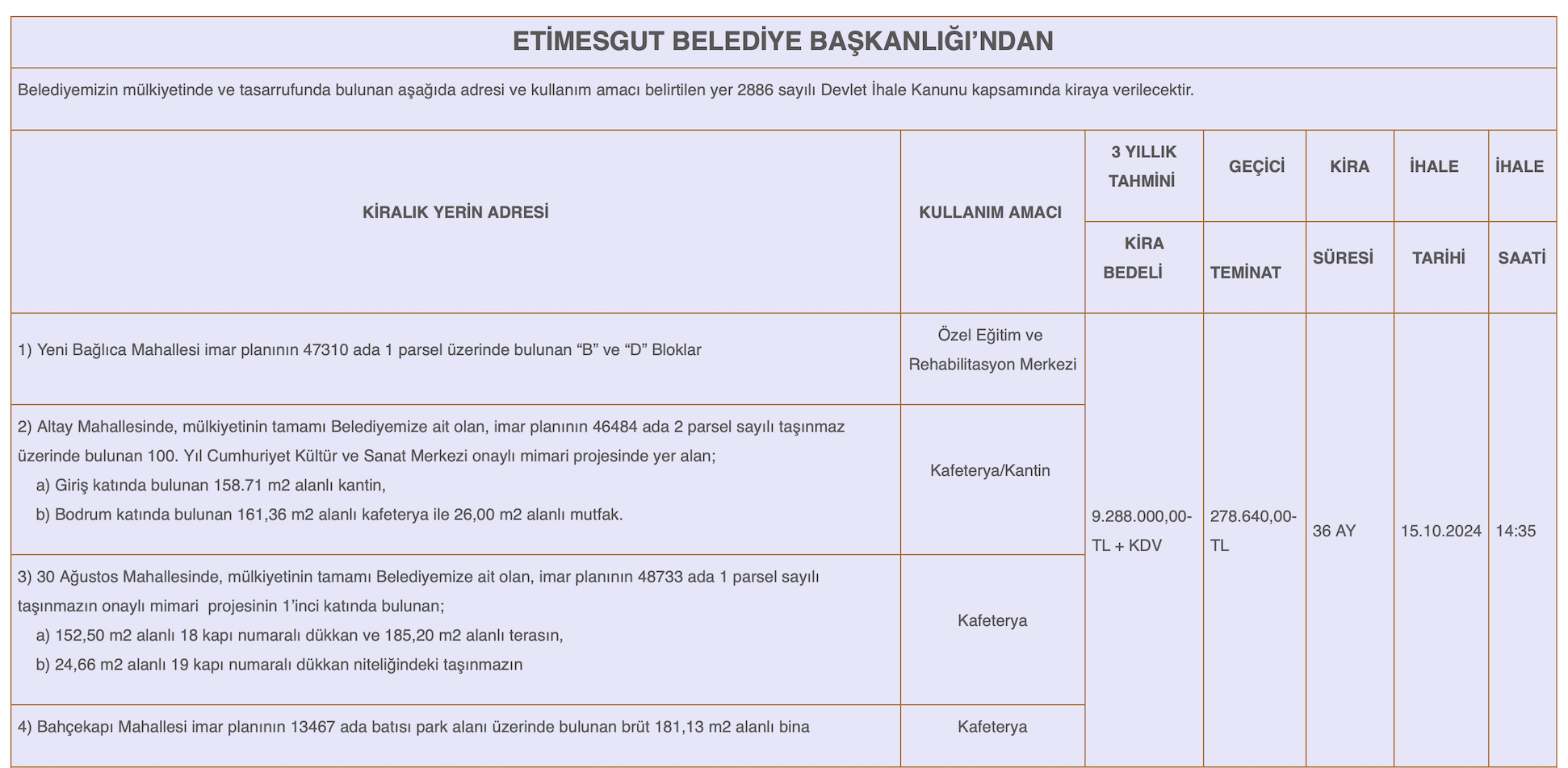 Etimesgut Belediyesi tarafından kiraya verilecek olan özel eğitim ve rehabilitasyon merkez, kafeterya/kantinin kira bedeli 9 milyon 288 bin TL şeklinde açıklandı. Toplam 4 adet gayrimenkulün kiralama ihalesi 15 Ekim’de yapılacak.