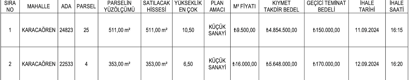 İlçemiz sınırları içerisinde; mülkiyeti Belediye Başkanlığımıza ait Karacaören Mahallesinde bulunan ve aşağıda, bilgileri yer alan taşınmazların; 2886 sayılı Kanunun 45. maddesine göre 03.01.2023 tarih ve 6 sayılı Meclis Kararına ve 14.08.2024 tarih 317 sayılı Encümen Kararına istinaden “Açık Teklif Usulü(artırmalı)” yöntemi geçerli olacak şekilde taşınmaz satış ihalesi gerçekleştirilecek olup; satış bedeli, hesaplanan diğer vergi ve harçlar ile tüm giderler peşin olarak müşteri tarafından ödenmek kaydı ile taşınmaza ait tapu devir işlemi İdaremizce sağlanacaktır. İhalede 2886 sayılı Kanunun 45. maddesi kapsamında “Açık Teklif Usulü(artırmalı)” yöntemi kuralları geçerlidir. 1-İhale işlemi 11.09.2024 Çarşamba Günü saat 16:00’ da Altındağ Belediyesi Başkanlık Binası Zübeyde Hanım Mahallesi 657. Sokak No: 14 Altındağ/ANKARA adresinde bulunan 9. Kat Encümen Toplantı salonunda toplanan Altındağ Belediyesi Encümeni huzurunda istekliler arasında gerçekleştirilecektir. 2-Bu ihaleye ait şartname Altındağ Belediye Başkanlık Binası 5. Katta bulunan Emlak ve İstimlak ve Müdürlüğünden en geç 10 Eylül 2024 Salı günü saat 16:00’ya kadar görülüp temin edilecektir. 3-İhaleye girebilmek için isteklilerden şu şartlar aranır. -Adı Soyadı -Firma Ünvanı -Adresi -İmzalı Taşınmaz Mal Satış Şartnamesi -Geçici Teminat bedeli İdare hesabına en geç 10 Eylül 2024 Salı günü saat 16:00’ya kadar yatırılmış olunmalıdır. -İsteklilerin gerçek kişi olmaları halinde; nüfus kayıt örneği veya kimlik fotokopisi, ikametgah belgesi -İsteklilerin tüzel kişi olmaları halinde; idari merkezinin bulunduğu yer mahkemesinden veya sicilin kayıtlı olduğu ticaret odasından alınan faaliyet belgesi, ticaret sicil gazetesi, şirket yetkilisi imza sirküsü veya şirketin ‘vekili’ olduğunu gösterir noter tasdikli vekaletname, vekalet ile temsil yetkisi alan temsilcinin noterden tasdikli imza beyannamesi, kimlik belgesi, ihaleye konu iş tanımı yetkisi -İsteklilerin dernek, federasyon, konfederasyon, kooperatif veya vakıf olması halinde; resmi makamdan alınmış faaliyet belgesi, gayrimenkul alınmasına yönelik ve ihaleye katılmasını belirtir, noter onaylı genel kurul kararı, noter tasdikli temsilci yetkisi, temsilcinin noter tasdikli imza beyannamesi, kimlik belgesi, ihaleye konu iş tanımı ve katılma yetki belgesi.