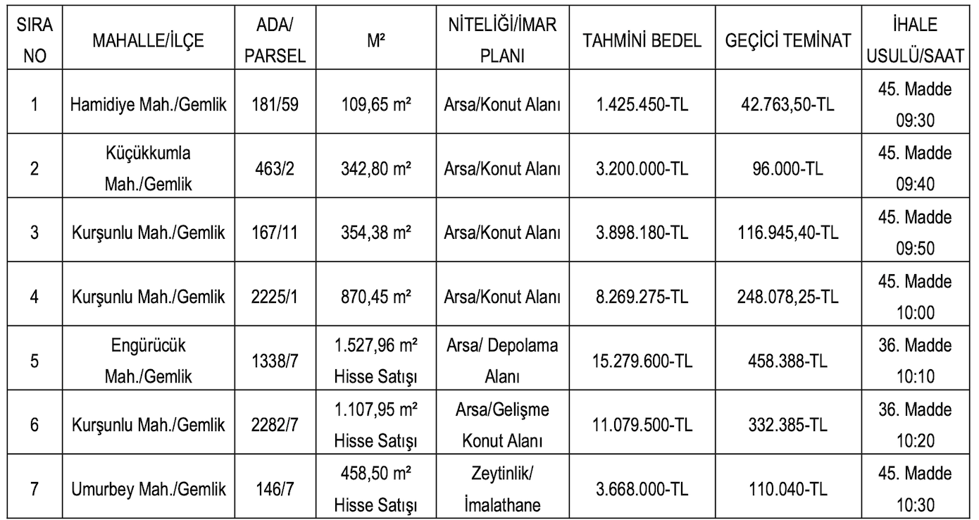 1- Gemlik Belediyesinin mülkiyetinde bulunan aşağıda tapu kaydı ve nitelikleri belirtilen taşınmazlar 2886 sayılı D.İ.K.'nun 36. Kapalı Teklif Usulü ve 45. Açık Teklif Usulü maddelerine göre satılacaktır. İhale 12.09.2024 Perşembe günü saat 09:30'da başlayarak sıra numarasına göre yapılacaktır. Her taşınmazın müracaatı ayrı olup, ihaleleri de ayrı ayrı yapılacaktır.