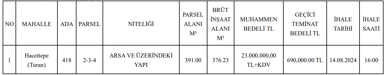 Ankara ve Kocaeli'de yer alan 4 arsa satışa çıkarıldı. Altındağ Belediye Başkanlığı tarafından satışa çıkarılan ve Ankara Hacettepe'de yer alan arsanın muhammen bedeli 23 milyon TL, geçici teminat bedeli ise 690 bin TL olarak açıklandı. Arsanın satış ihalesi 14 Ağustos'ta yapılacak.