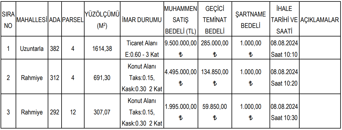 Kartepe Belediye Başkanlığı tarafından satışa çıkarılan ve Kocaeli Kartepe'de yer alan arsaların ise muhammen bedelleri 1 milyon 995 bin TL ile 9 milyon 500 bin TL arasında değişirken, geçici teminat bedelleri ise 59 bin 850 TL ile 285 bin TL arasında değişiyor.