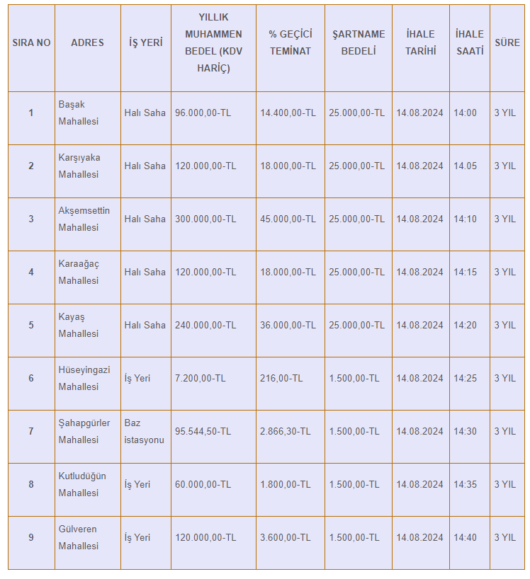 1- İlçemiz Kutludüğün, Gülveren ve Hüseyingazi Mahallelerinde bulunan 3 adet iş yeri, Şahapgürler Mahallesinde bulunan 1 adet Baz İstasyonu ve Başak, Akşemsettin, Karaağaç, Lalahan ve Kayaş Mahallelerinde bulunan 5 adet halı saha amaçlı taşınmaz, 2886 Sayılı Devlet İhale Kanununun 45. maddesine göre ‘Açık Teklif Usulü’ ile 14.08.2024 tarihinde Çarşamba günü saat 14.00’de Mamak Belediye Başkanlık Binası 7. Kat Encümen salonunda ihale edilerek kiraya verilecektir.