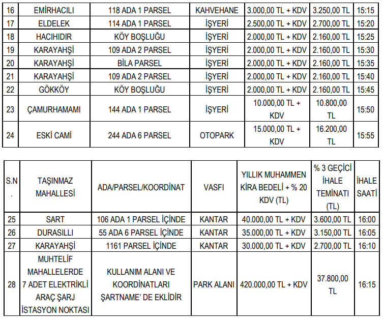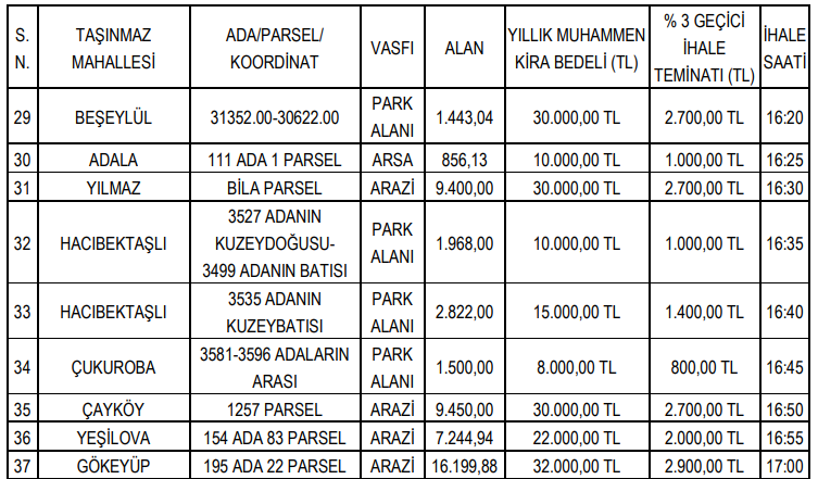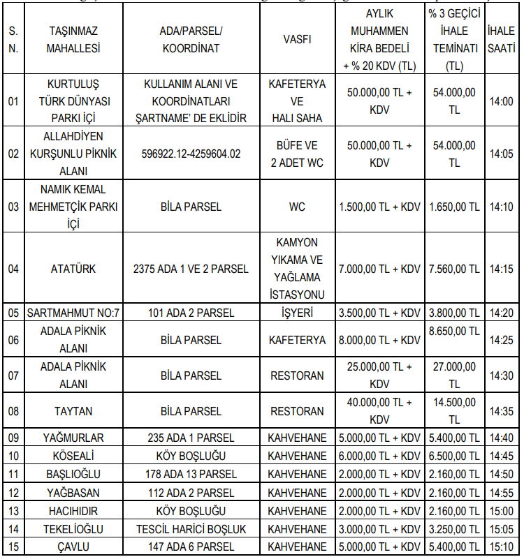 aşağıda listede belirtilen saatlerde “Açık Teklif Artırma Usulüne göre” kiralama ihalesi