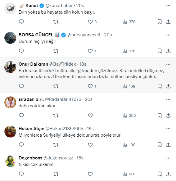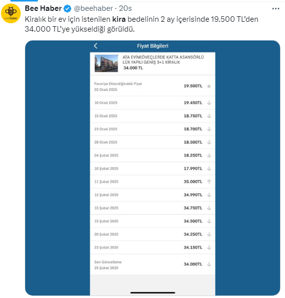 Ülke genelinde kiralar fahiş rakamlara yükselmeye başladı. Özellikle büyükşehirlerde kiralarda ipin ucu kaçtı. Vatandaşlar bütçelerine uygun kafalarına göre ev bulmakta zorlık çekiyor. Bee Haber de sosyal medya hesabı X'ten konuyu özetler nitelikte paylaşımda bulundu.