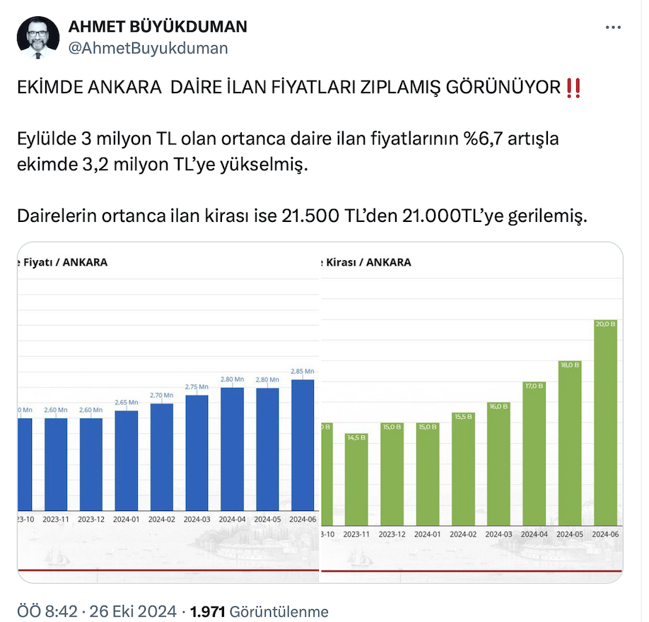 Dr. Ahmet Büyükduman paylaşımında Eylül ayında 3 milyon TL olan daire ilan fiyatının Ekim ayında yüzde 6,7 artışla 3.2 milyon TL’ye çıktığını belirtti.