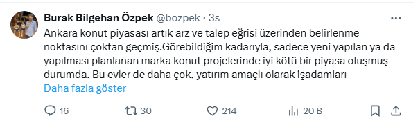Burak Bilgehan Özpek, sosyal medya hesabı X'ten Ankara'daki konut piyasasının ne durumda olduğunu tüm detaylarıyla anlattı. İşte o paylaşım....