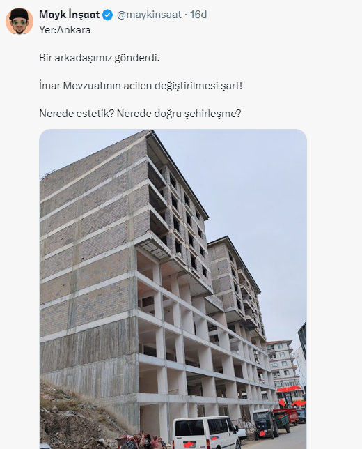 Akademisyen İnşaat Mühendisi Mayk İnşaat, X sosyal medya hesabı üzerinden Ankara'da yeni yapılan bir binanın fotoğrafını paylaşarak 'Nerede doğru şehirleşme, nerede estetik?' yorumunda bulundu.