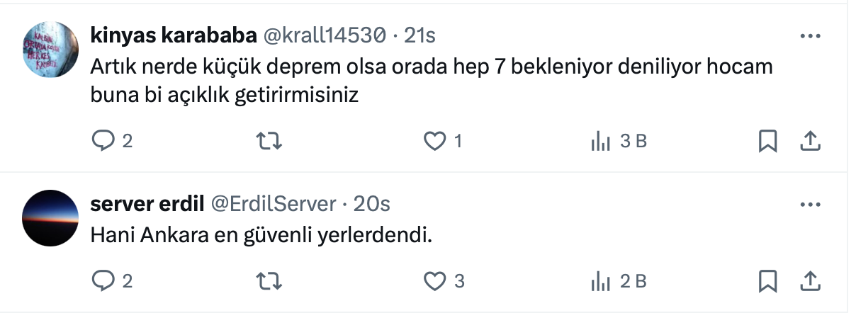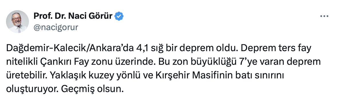 “Dağdemir-Kalecik/Ankara’da 4.1 sığ bir deprem oldu. Deprem ters fay nitelikli Çankırı Fay zonu üzerinde. Bu zon büyüklüğü 7’ye varan deprem üretebilir. Yaklaşık kuzey yönlü ve Kırşehir Masifi'nin batı sınırını oluşturuyor. Geçmiş olsun.”