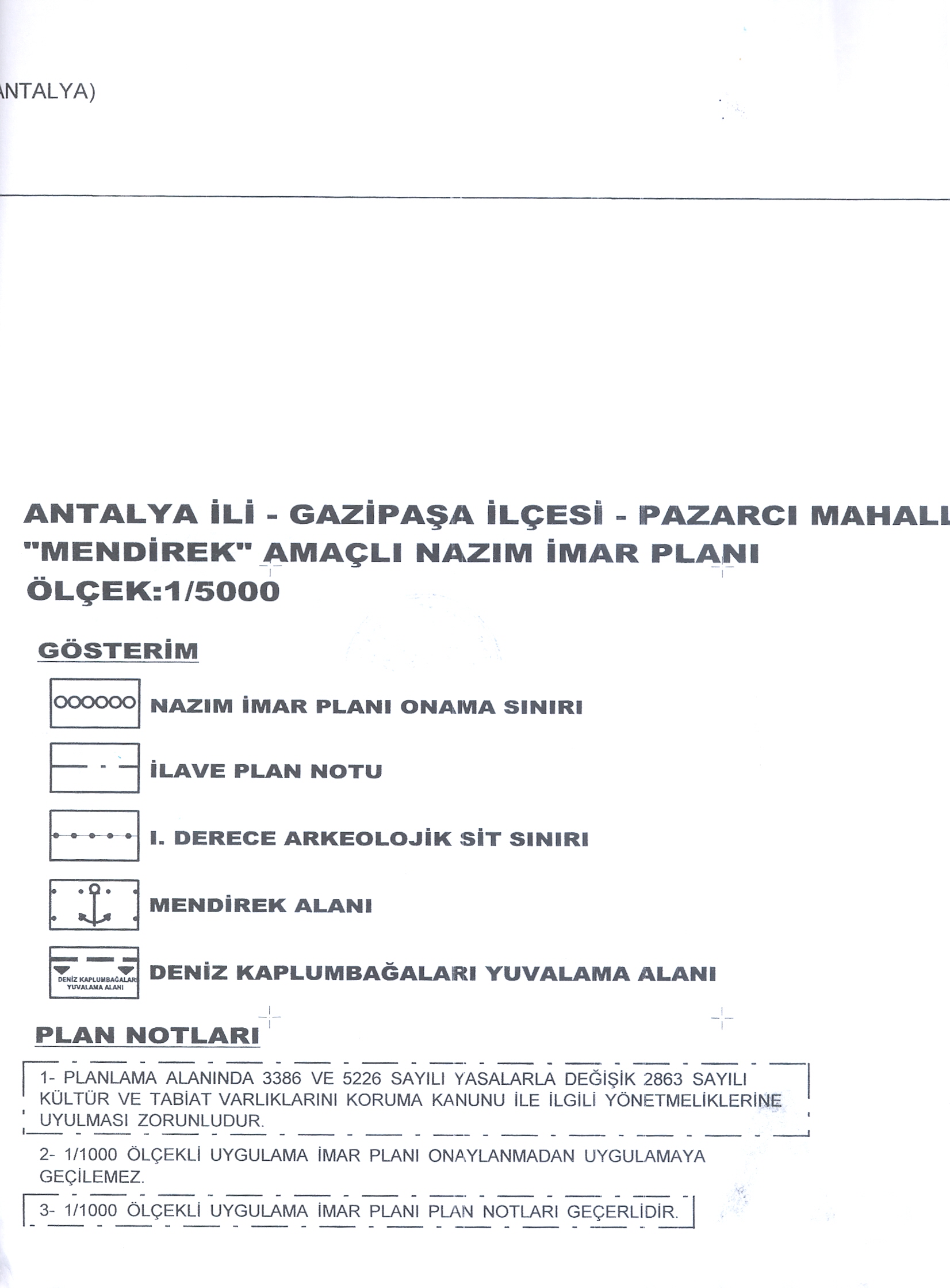 Antalya Gazipaşa 3. Derece Doğal Sit Alanı Hacımusa Çayı Taşkın Önleme Mendireğine ilişkin hazırlanan 1/5000 ve 1/1000'lik imar planları 15 Ağustos 2014 tarihinde yeniden askıya çıktı...