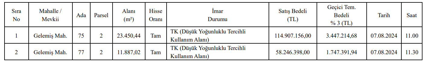 Kaş Belediye Başkanlığı tarafından satışa çıkarılan arsaların muhammen bedelleri 114 milyon 907 bin 156 TL ve 58 milyon 256 bin 398 TL olarak açıklanırken, geçici teminat bedelleri ise 3 milyon 447 bin 214 TL ve 1 milyon 747 bin 391 TL olarak açıklandı.