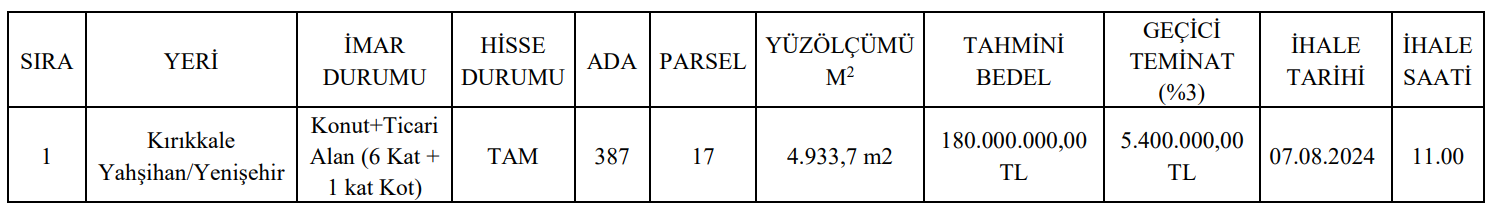 Kırıkkale Yahşihan'da yer alan ve Kırıkkale İl Özel İdaresi İl Encümeni Başkanlığı tarafından satışa çıkarılan arsa ise konut ve ticari alan imarlı olarak belirtildi. Satış ihalesi 7 Ağustos'ta yapılacak olan arsanın tahmini satış bedeli 180 milyon TL, geçici teminat bedeli ise 5 milyon 400 bin TL olarak açıklandı.