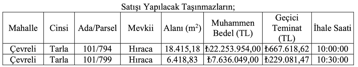 Çevreli Mahallesi’nde yer alan arazilerin muhammen bedelleri 22 milyon 253 bin 954 TL ve 7 milyon 636 bin 49 TL olarak açıklanırken, geçici teminat bedelleri ise 667 bin 618,62 TL ve 229 bin 081,47 TL olarak açıklandı.