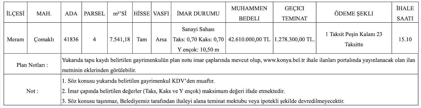 Konya Büyükşehir Belediye Başkanlığı tarafından satışa çıkarılan ve Meram Çomaklı’da yer alan arsa 7 bin 541,18 metrekare yüz ölçümüne sahip.