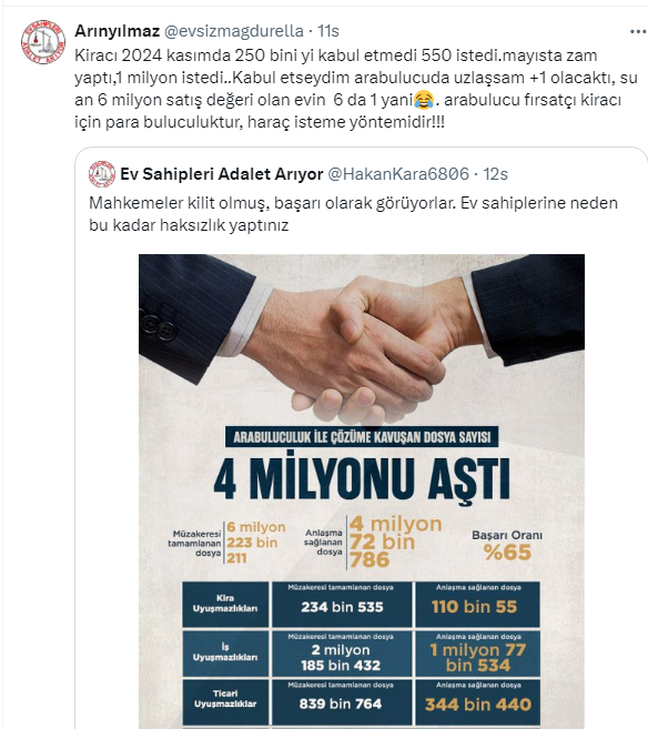 Mağdur ev sahibi Arın Yılmaz sosyal medya hesabından konuyu örnekle açıkladı. Kiracı evden çıkmak için 2024 Kasım'da 250 bin lirayı kabul etmeyip mayısta 1 milyon lira istediğini söyledi. Bunu kabul etmediğini söyleyen Yılmaz, 'bunu kabul etseydim arabulucuda uzlaşsam, +1 olacaktı'' dedi ve arabulucuğun, fırsatçı kiracılar için 'para buluculuktur' yorumunu yaptı.