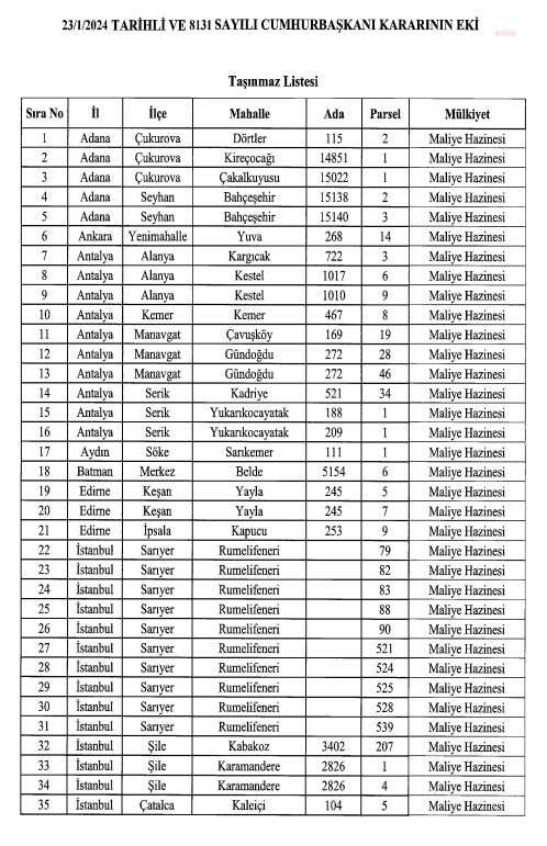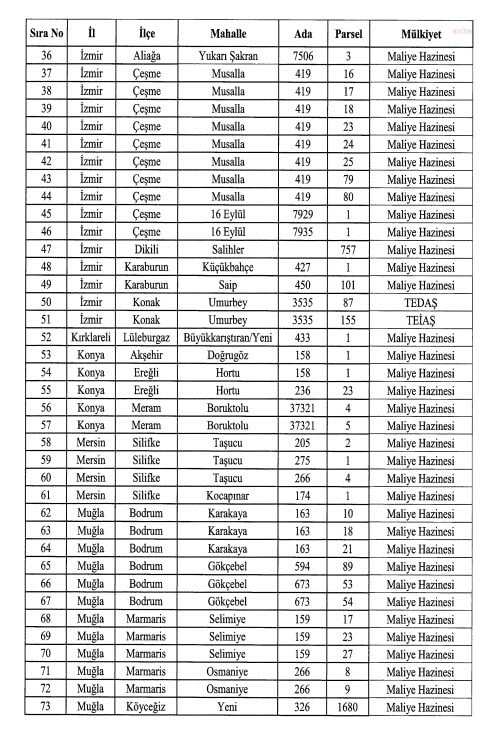 Söz konusu Cumhurbaşkanı kararına göre, özelleştirme kapsamına alınmış olan taşınmazlar Aydın, Adana, Ankara, İzmir, Antalya, Kırklareli, Batman, Edirne İstanbul, Konya, Mersin ve Muğla'da bulunuyor.