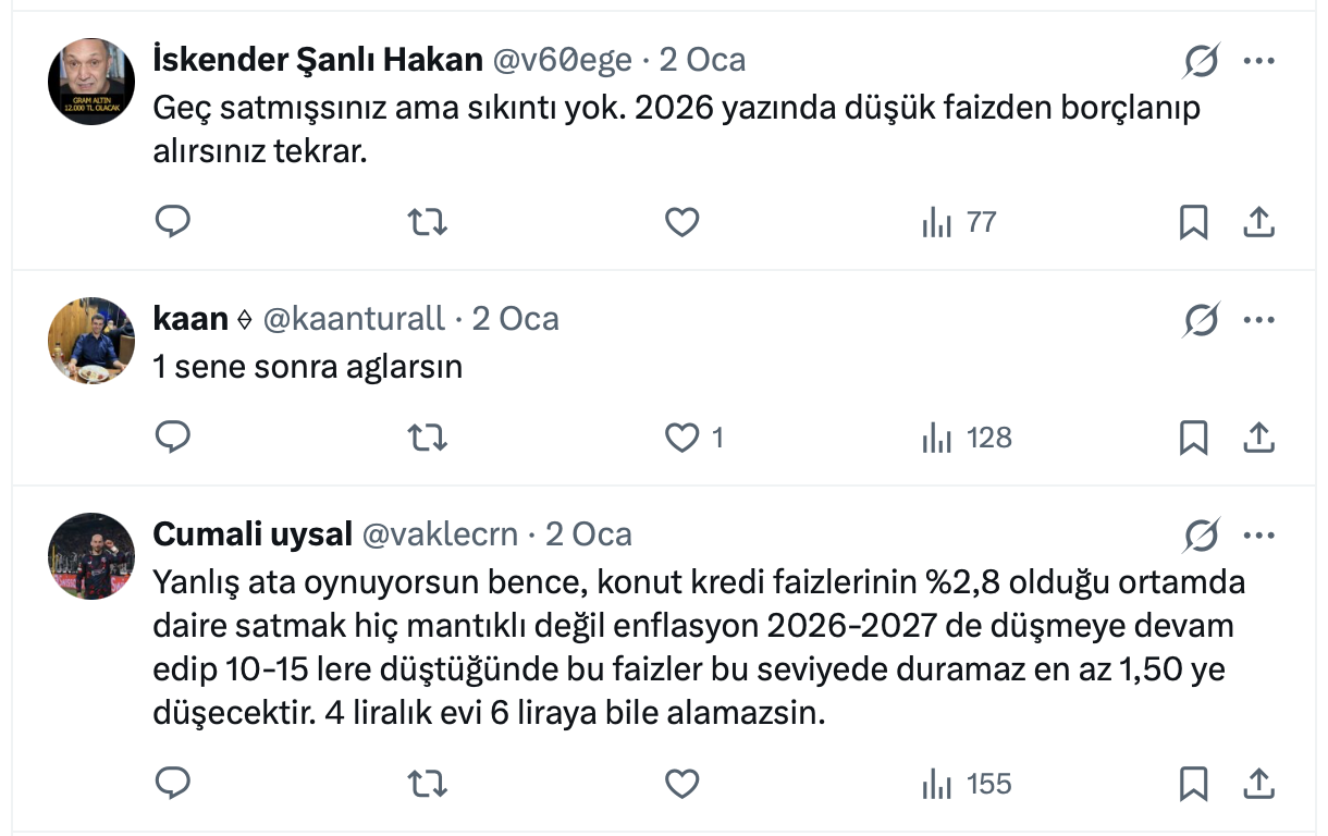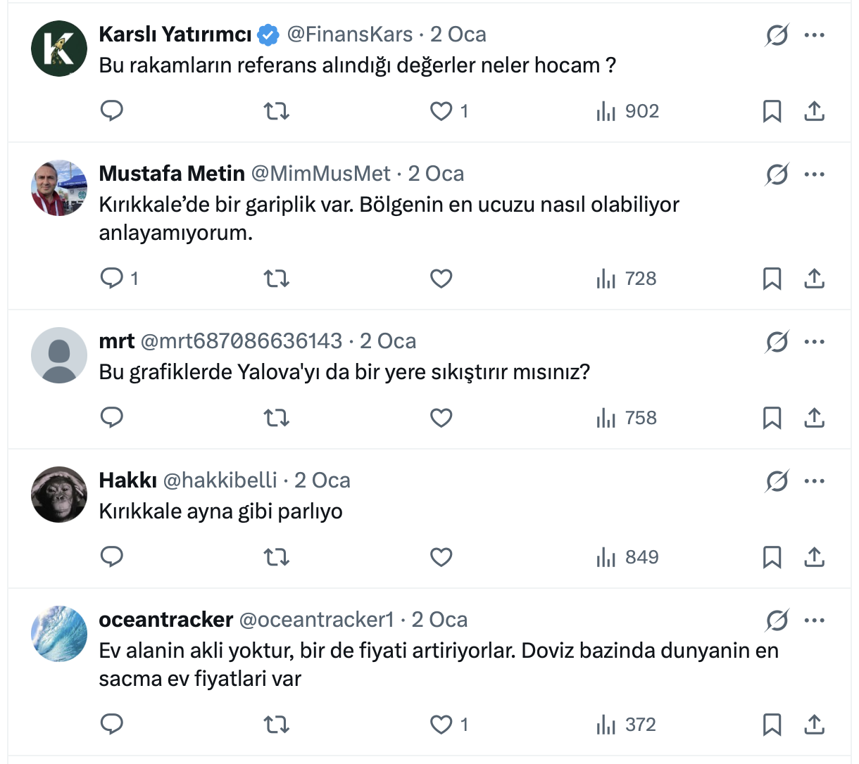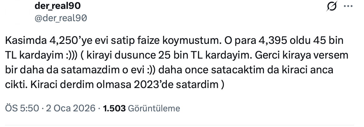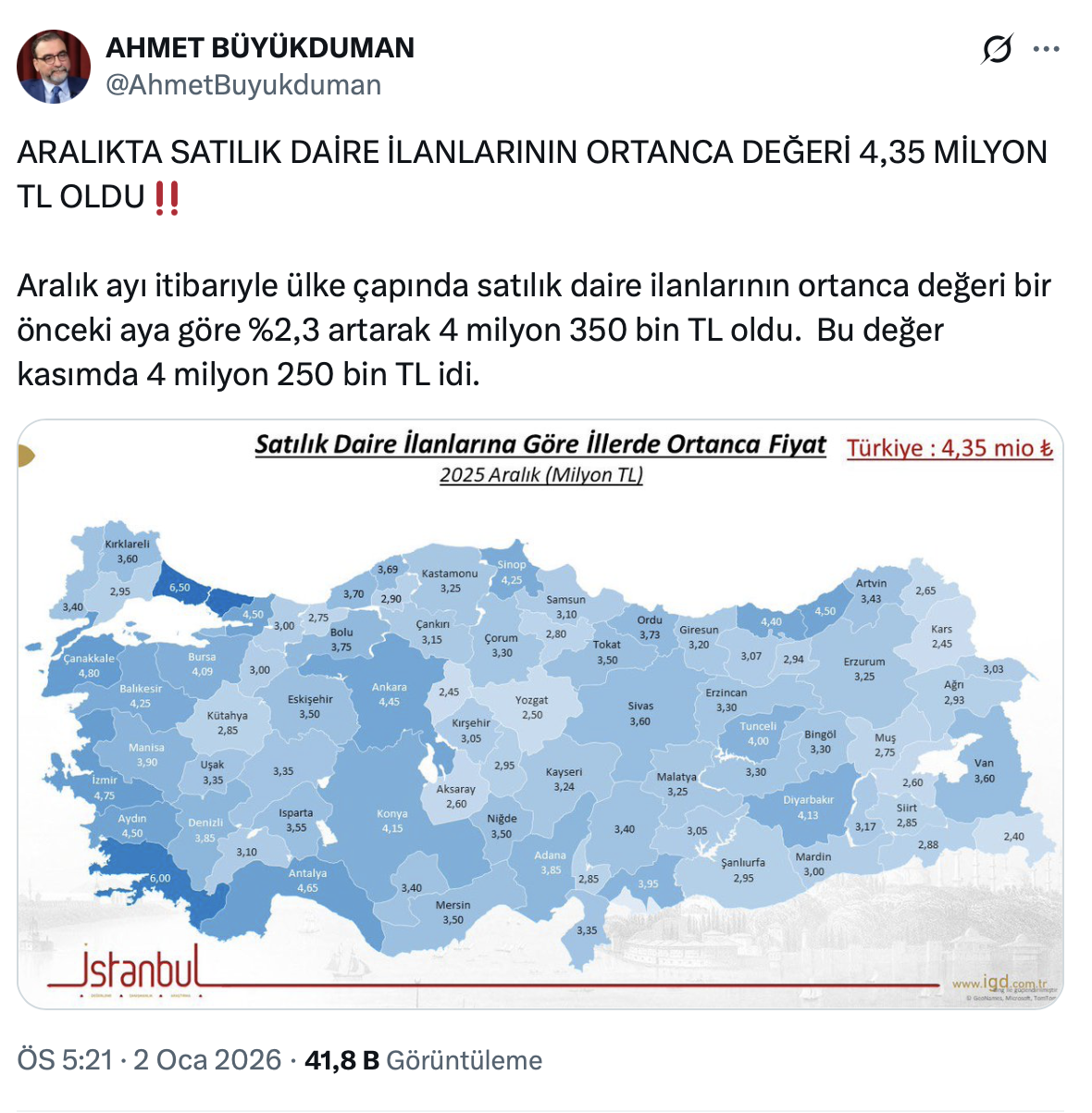 Ahmet Büyükduman resmi X hesabı https://x.com/AhmetBuyukduman üzerinden yaptığı paylaşımda Aralık’ta satılık daire ilanlarının ortanca değerinin 4,35 milyon TL olduğunu söyledi.