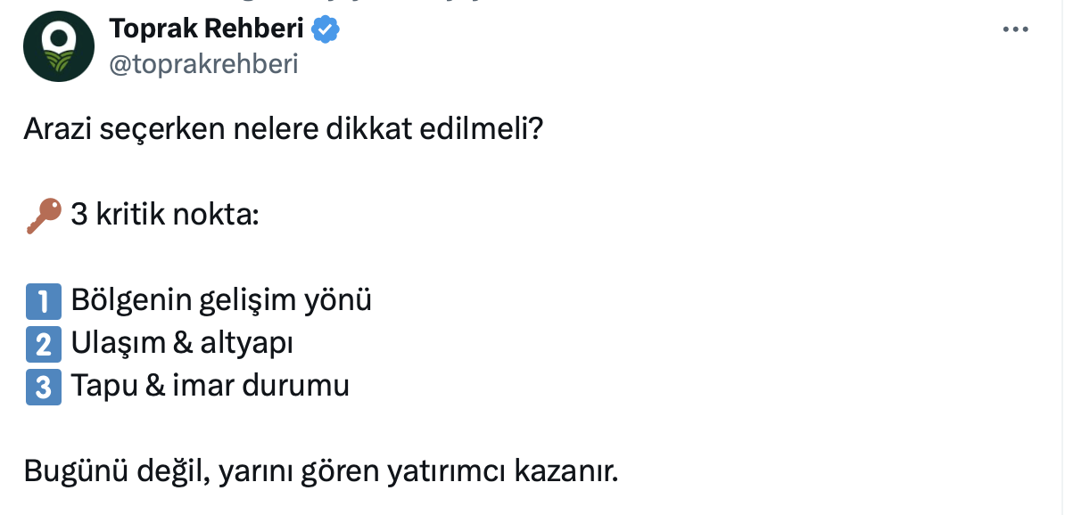 Yeni bir yatırım yapmak isteyen pek çok kişi konut, arsa ve arazi yatırımları ile detayları araştırırken, 2,167 takipçili Toprak Rehberi’nin resmi sosyal medya hesabı https://x.com/toprakrehberi üzerinden bir paylaşım geldi. Söz konusu paylaşımda arazi seçerken nelere dikkat edilmesi gerektiği açıklandı.