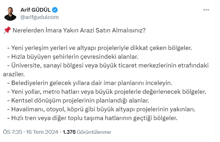 Yeni bir arsa veya arazi almak isteyenler hangi detaylara dikkat etmeleri gerektiğini merak ederken Toprak Yatırımcısı ve talepbul'un Yönetim Kurulu Başkanı Arif Güdül, resmi sosyal medya hesabı https://twitter.com/arifgudulcom üzerinden "Nerelerden imara yakın arazi satın almalısınız?" sorusuna yanıt verdi.