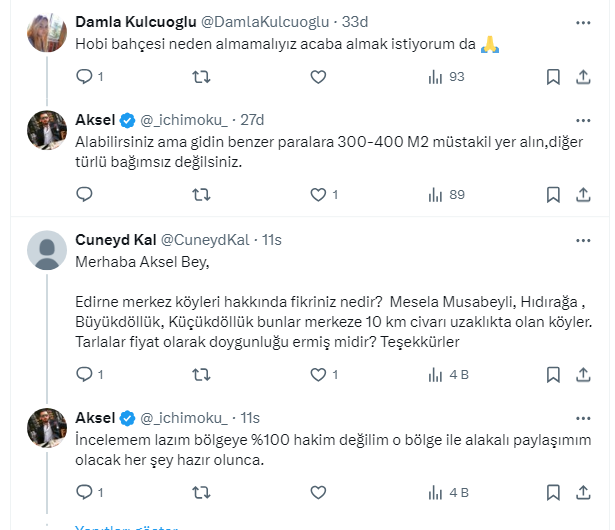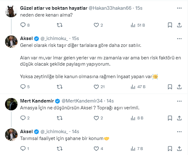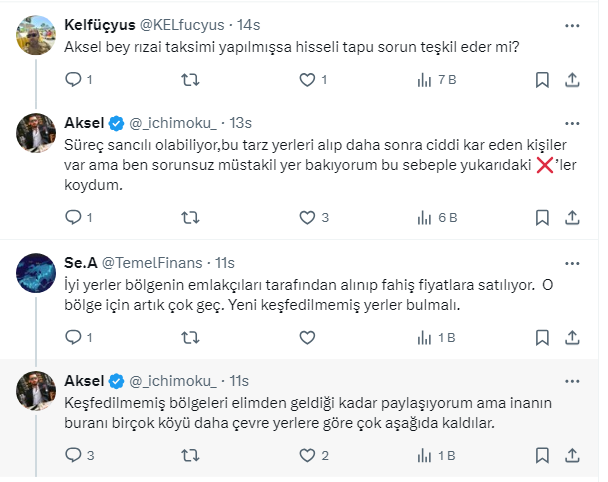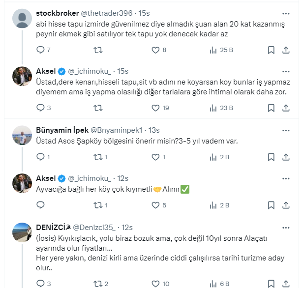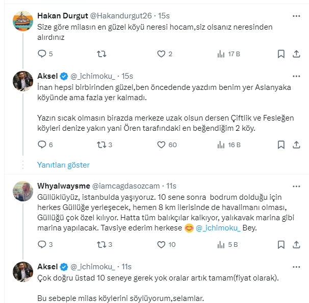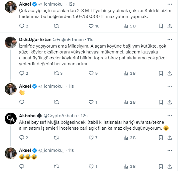 Konut fiyatlarında yaşanan hızlı yükseliş vatandaşları gayrimenkulde farklı yatırım araçlarına yönlendirdi. Son dönemde arsa ve arazi yatırımlarına olan ilgi arttı. Sosyal medyada Aksel kulanıcı adıyla yatırım tavsiyelerini aktaran yatırımcı pttps://twitter.com/_ichimoku_X sosyal medya hesabından yaptığı paylaşımda, arsa yatırımda son yılların yükselen değeri Milas ve Köyleri olduğunu söyledi. Aksel, elined 150-750 bin TL’si olanlar için köylerin isimlerini tek tek saydı. Arazi almak isteyenlerin kafasındaki soruları cevaplayarak, dikkat edilmesi gerekenleri anlattı.
