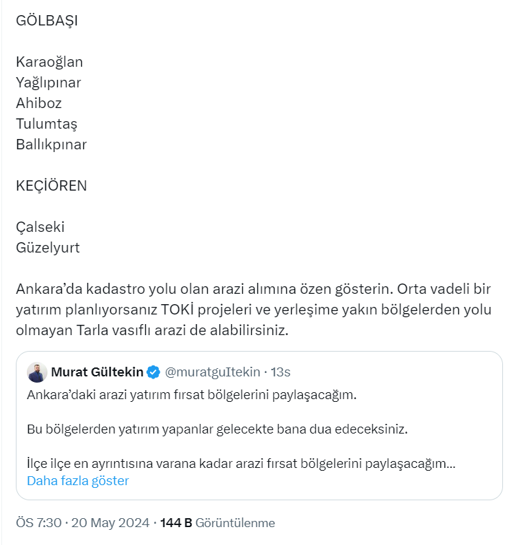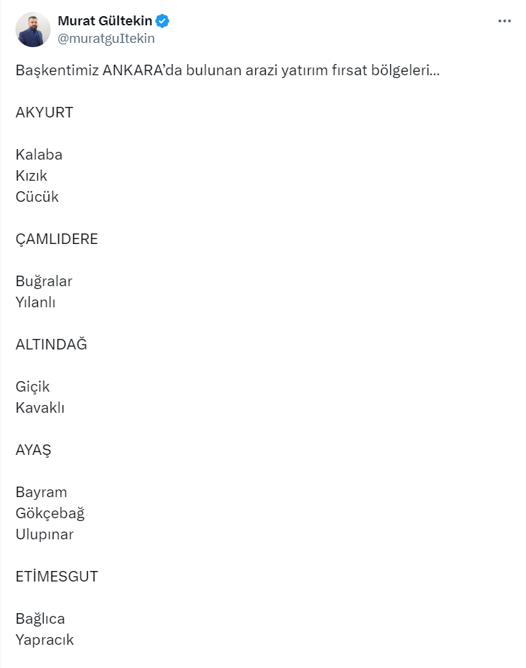 Yatırımcılara altın niteliğinde çok önemli bazı bilgiler veren Gayrimenkul Uzmanı Murat Gültekin resmi X hesabı https://twitter.com/muratguItekin üzerinden yine önemli bir paylaşım yaptı. Murat Gültekin paylaşımında Ankara'daki fırsat bölgeleri açıkladı.